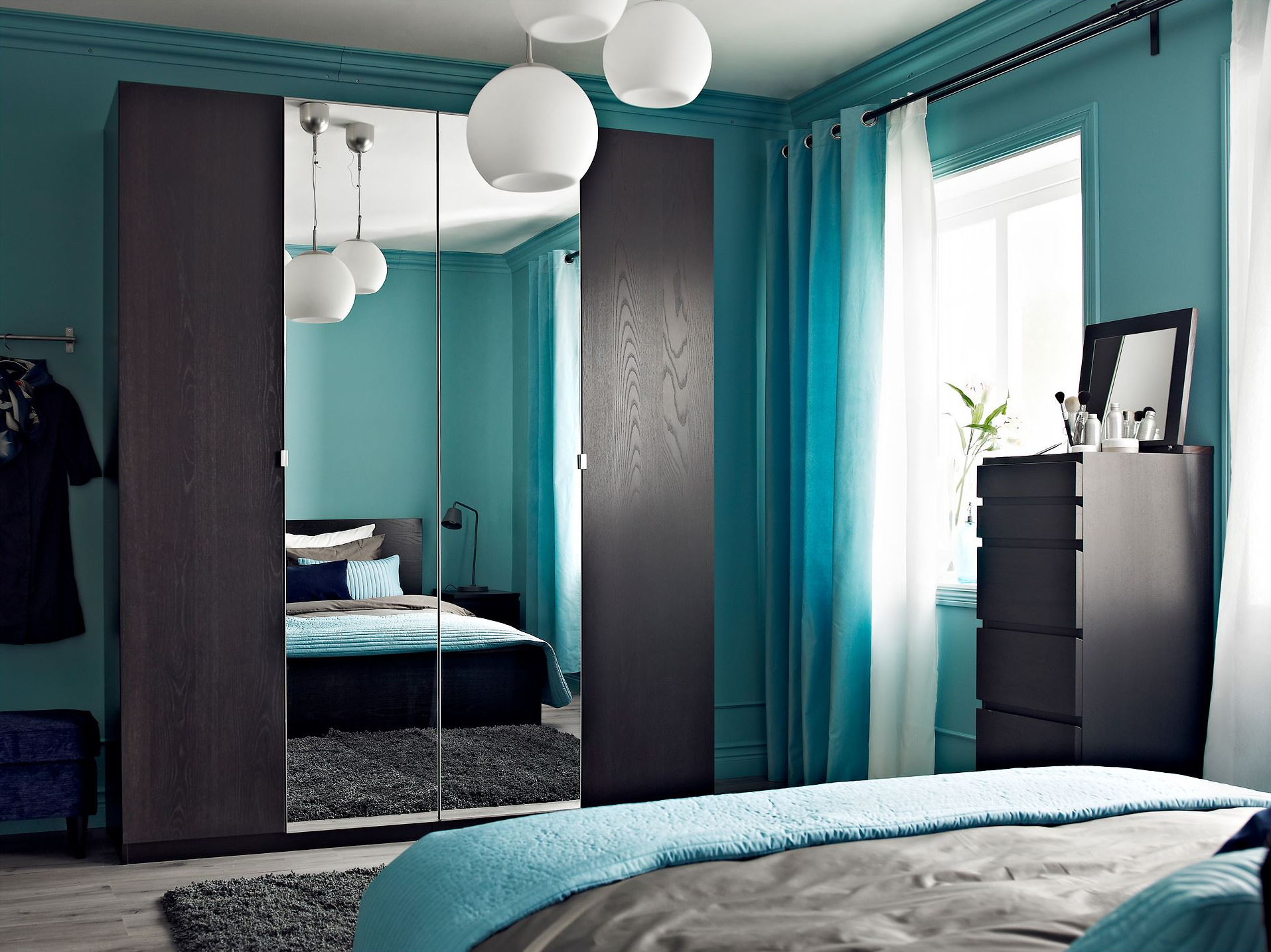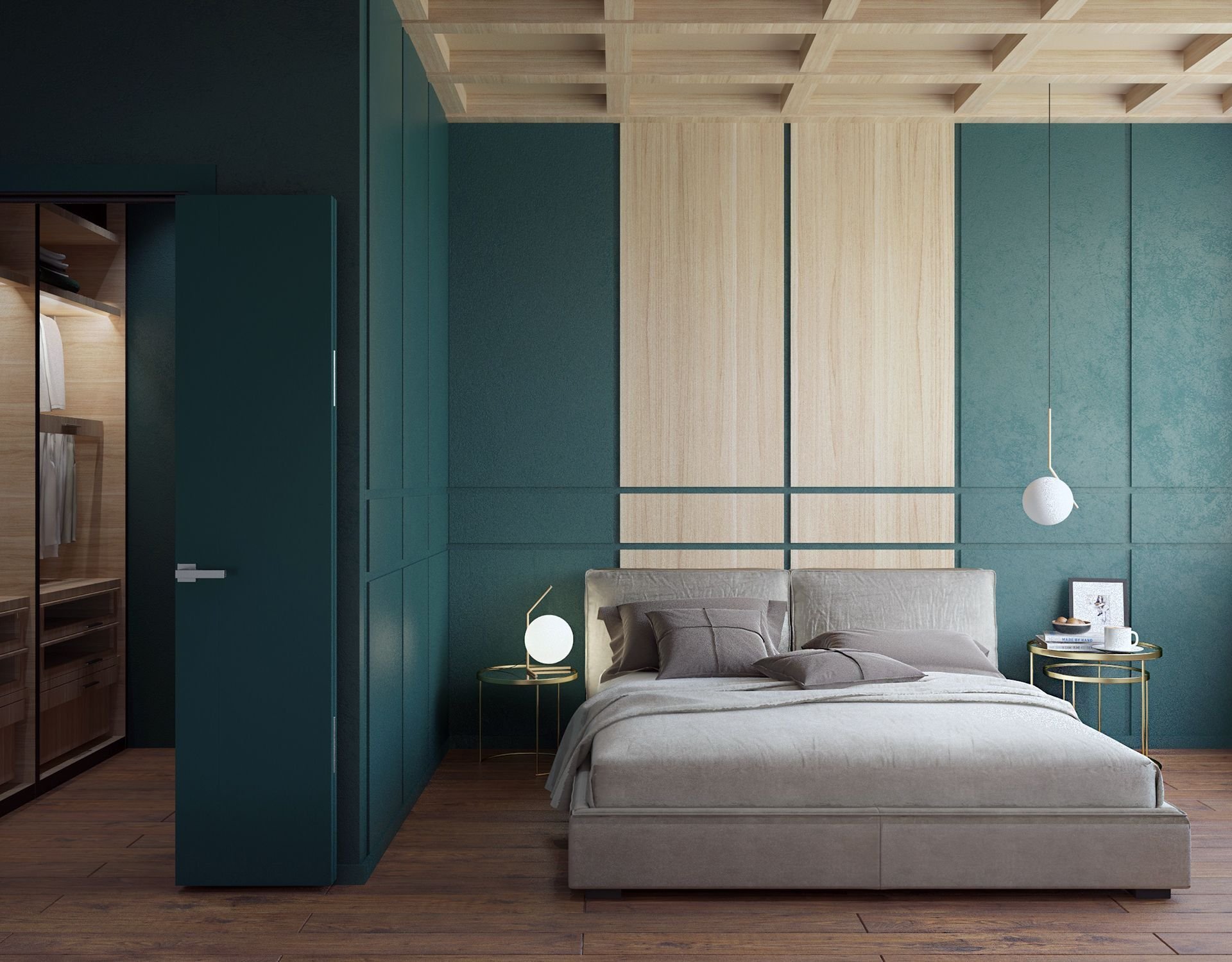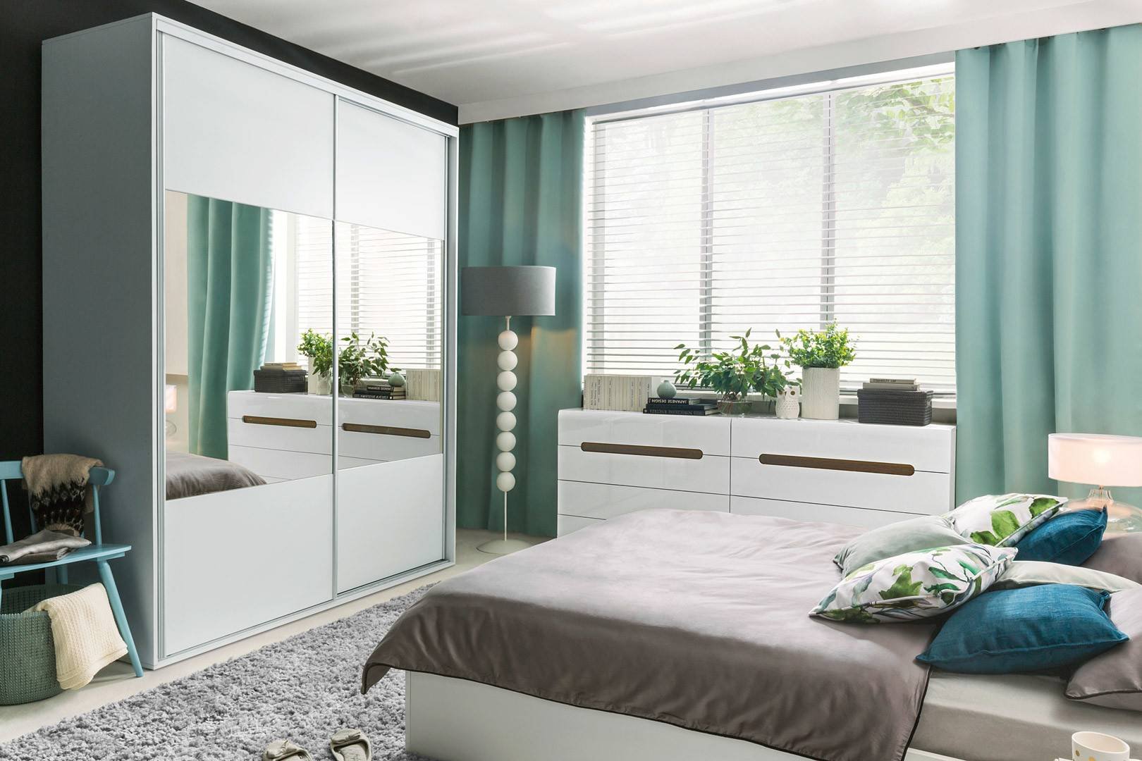 Шкаф изумрудного цвета в интерьере спальни