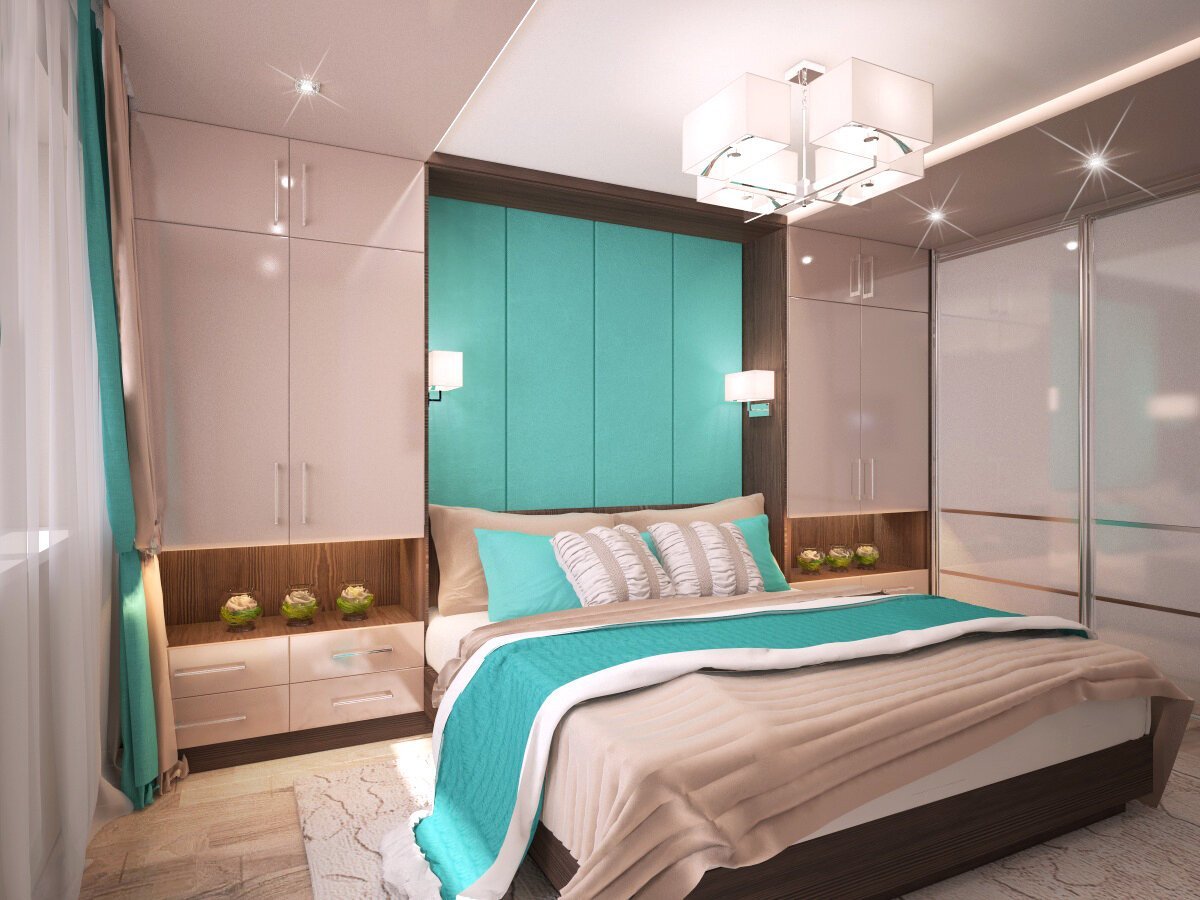 Спальня в мятном цвете с шкафом купе
