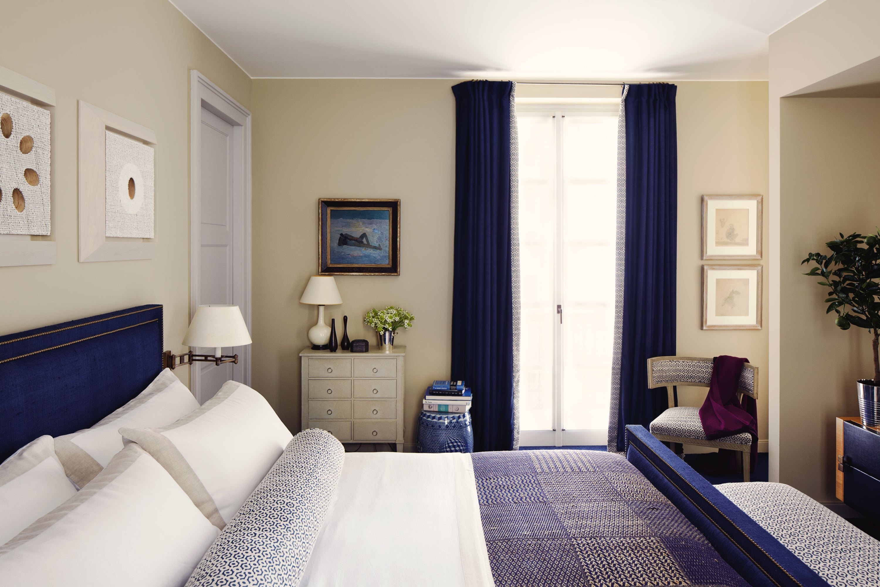 Спальня в синем и бежевом цвете