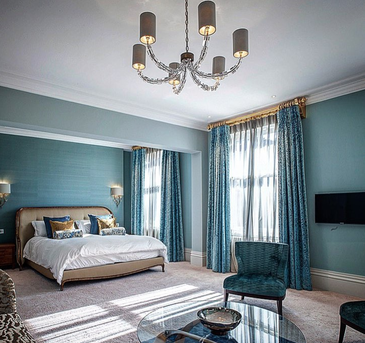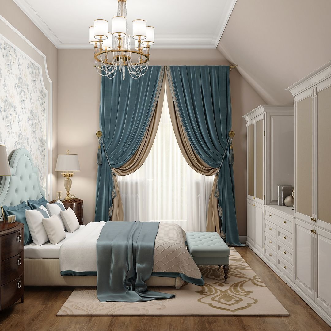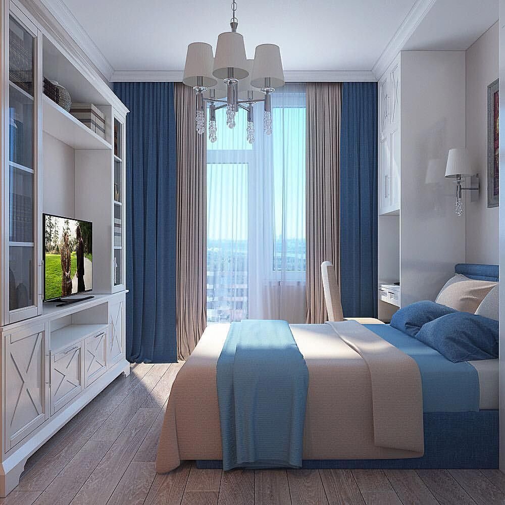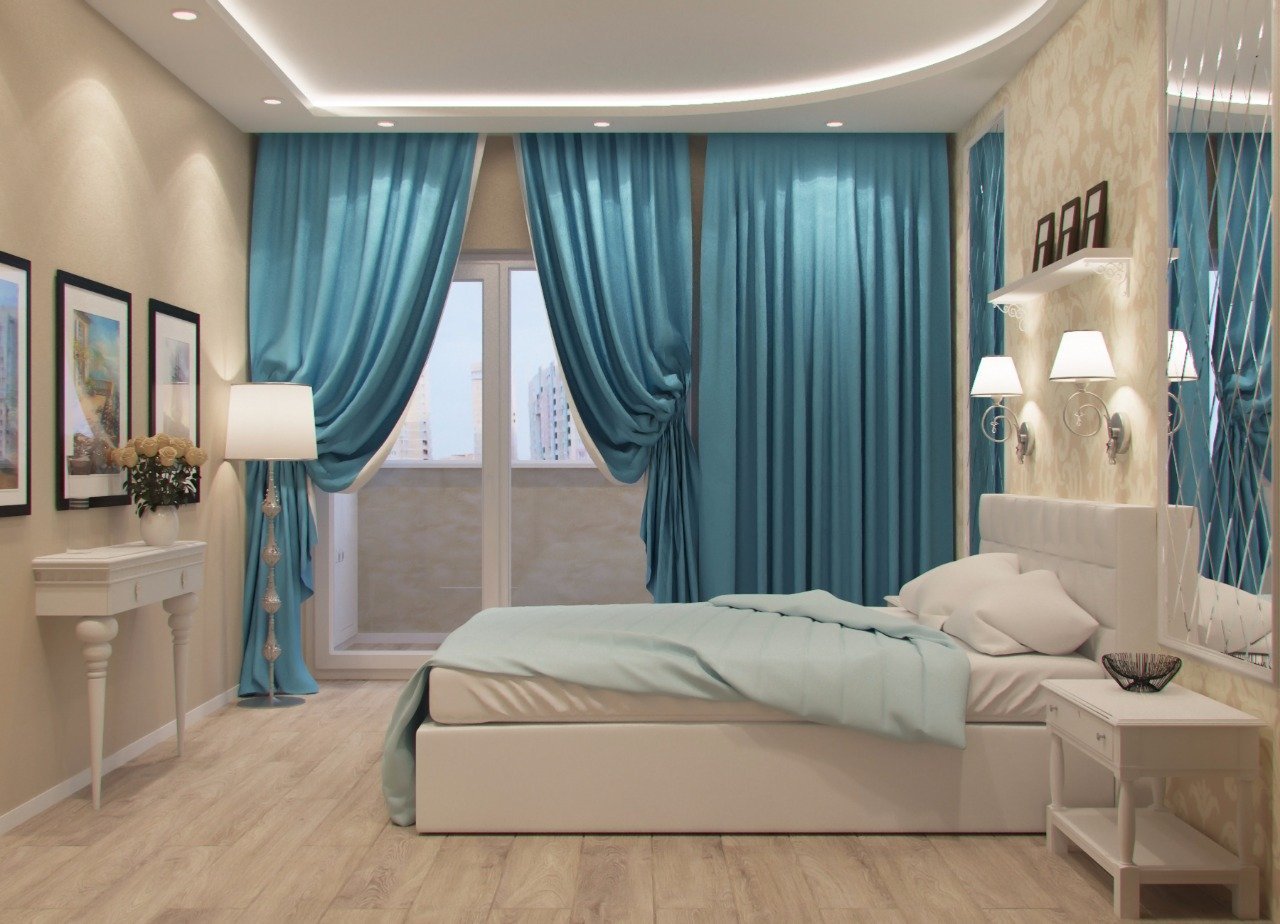 Синие шторы в интерьере спальни