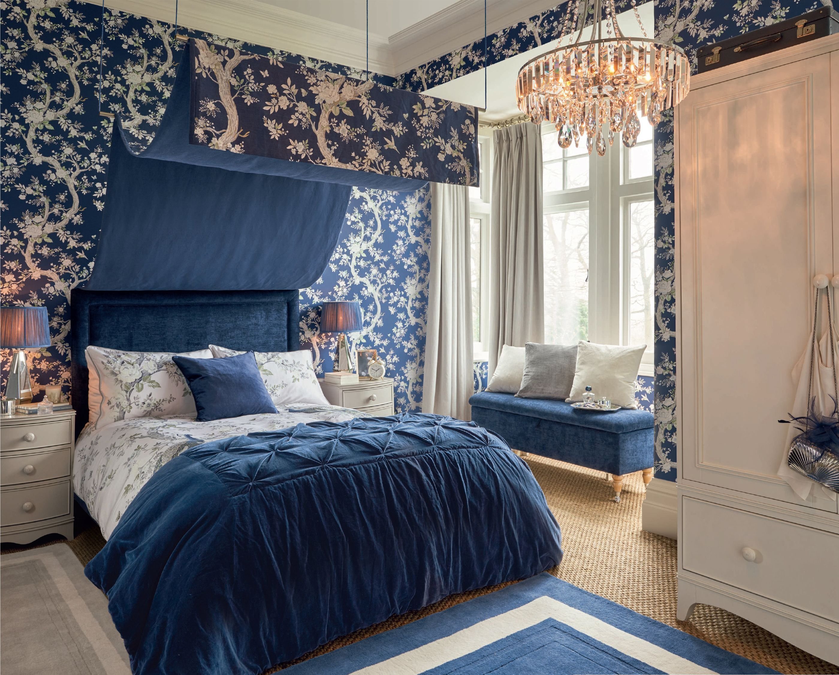 Синяя кровать в интерьере спальни