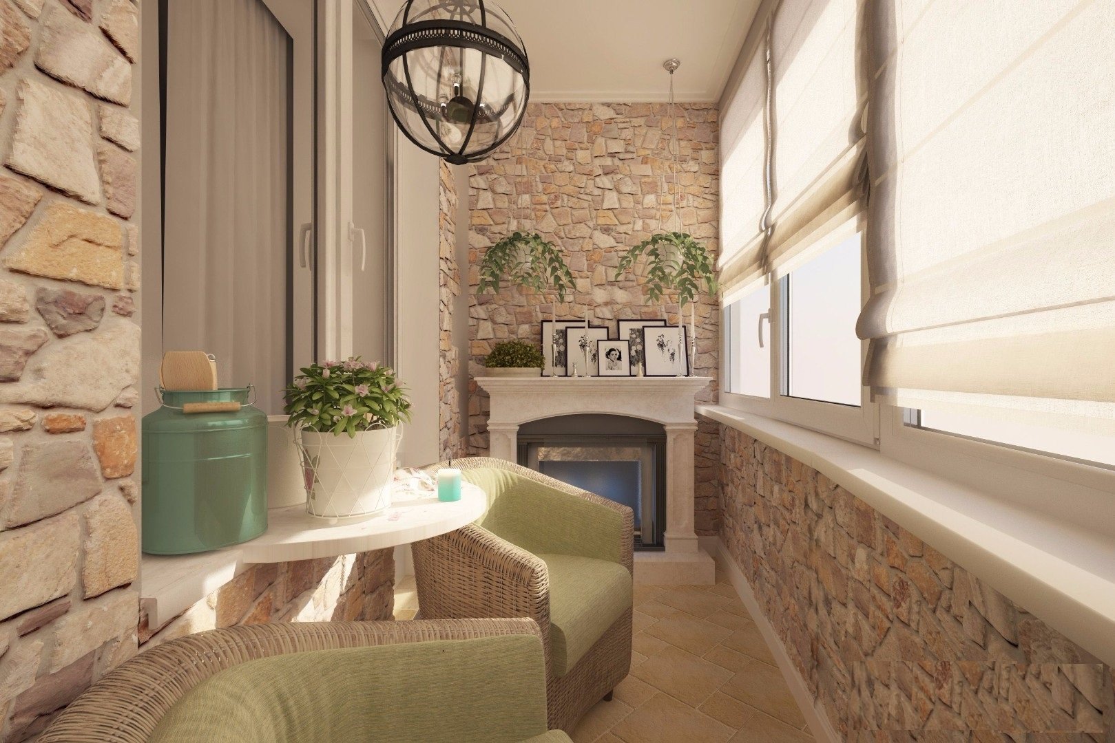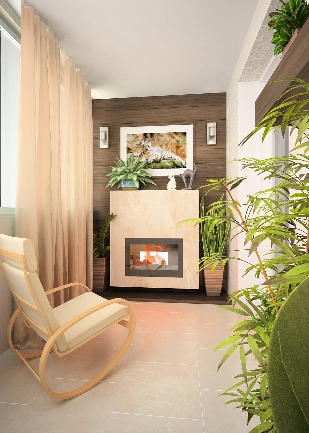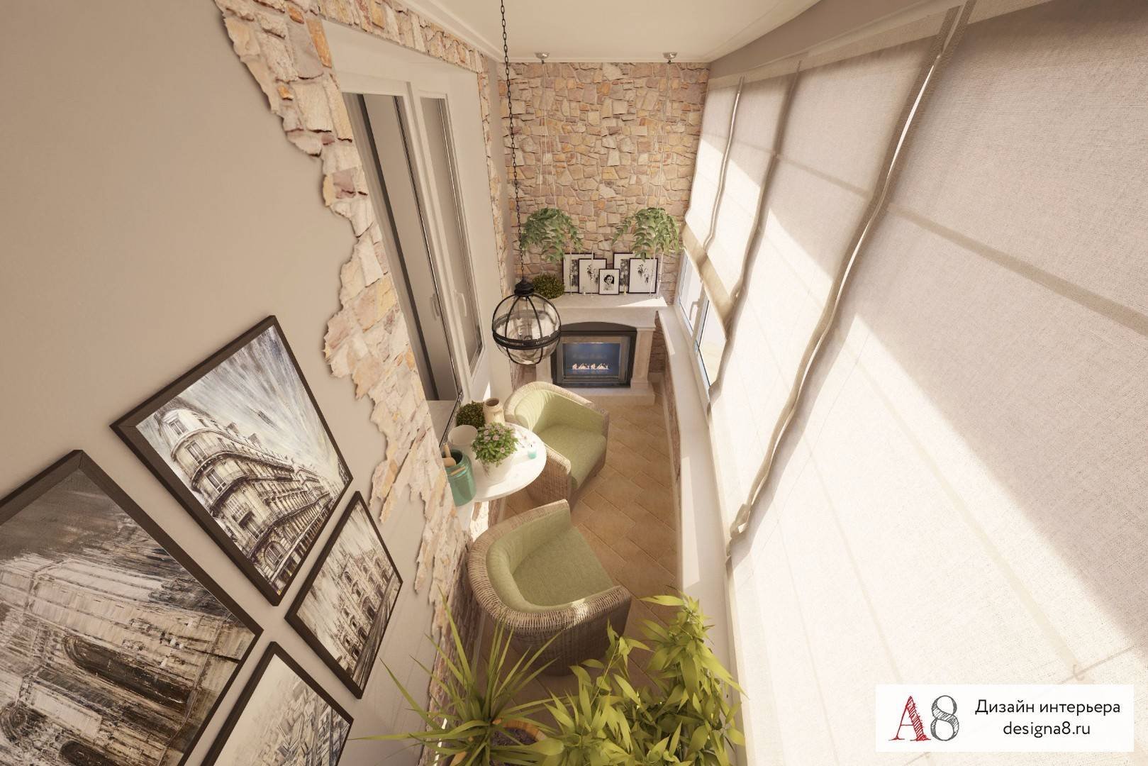 Интерьер балкона с камином