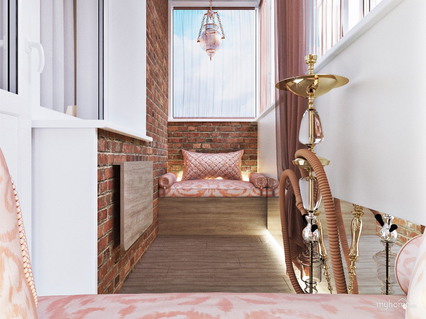 Розово золотой интерьер балкона