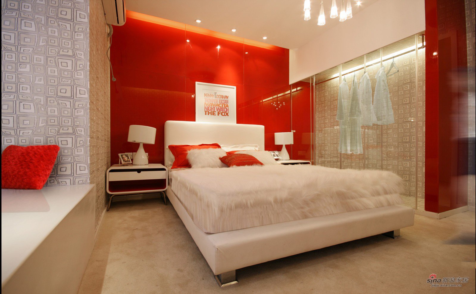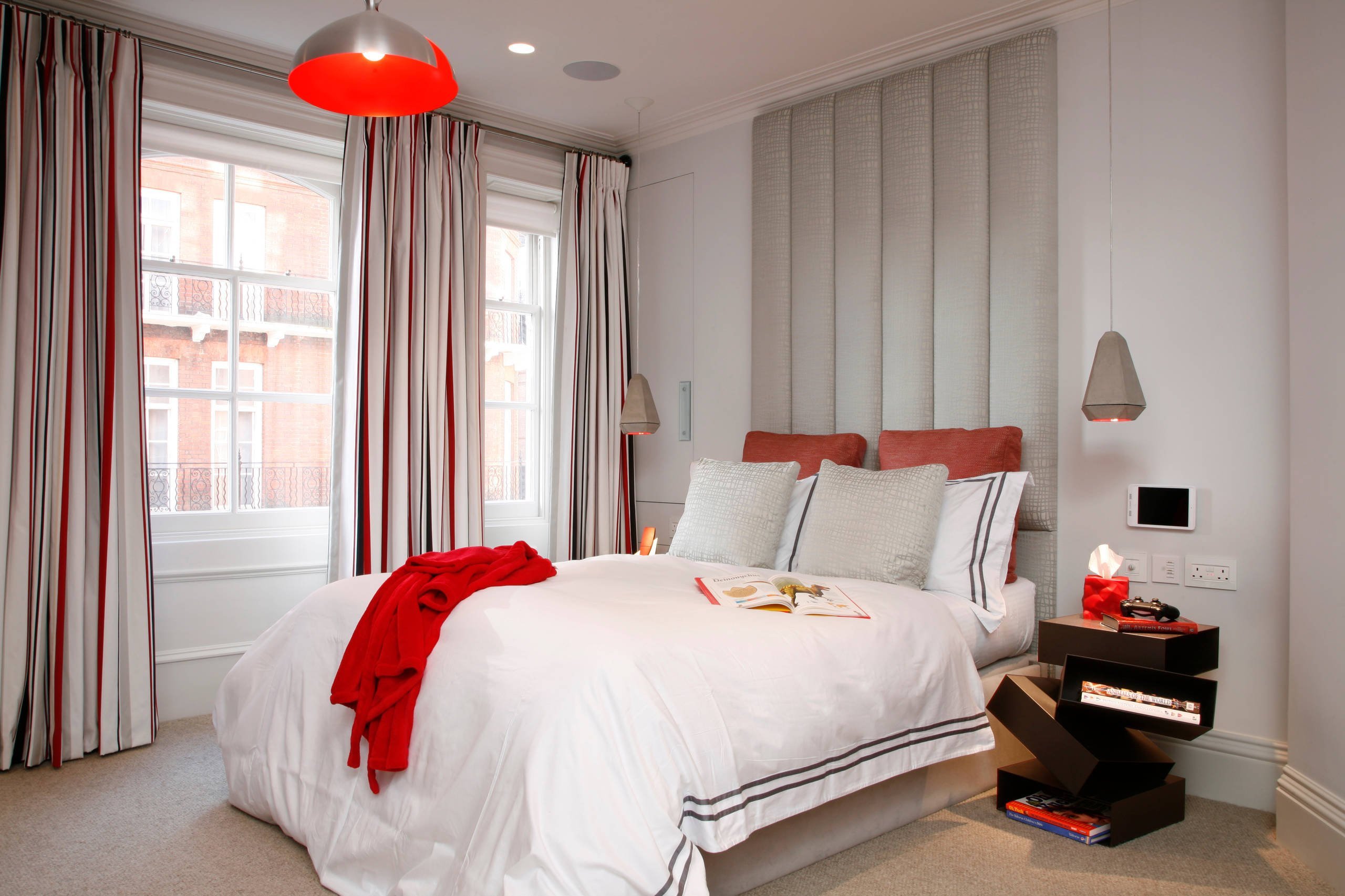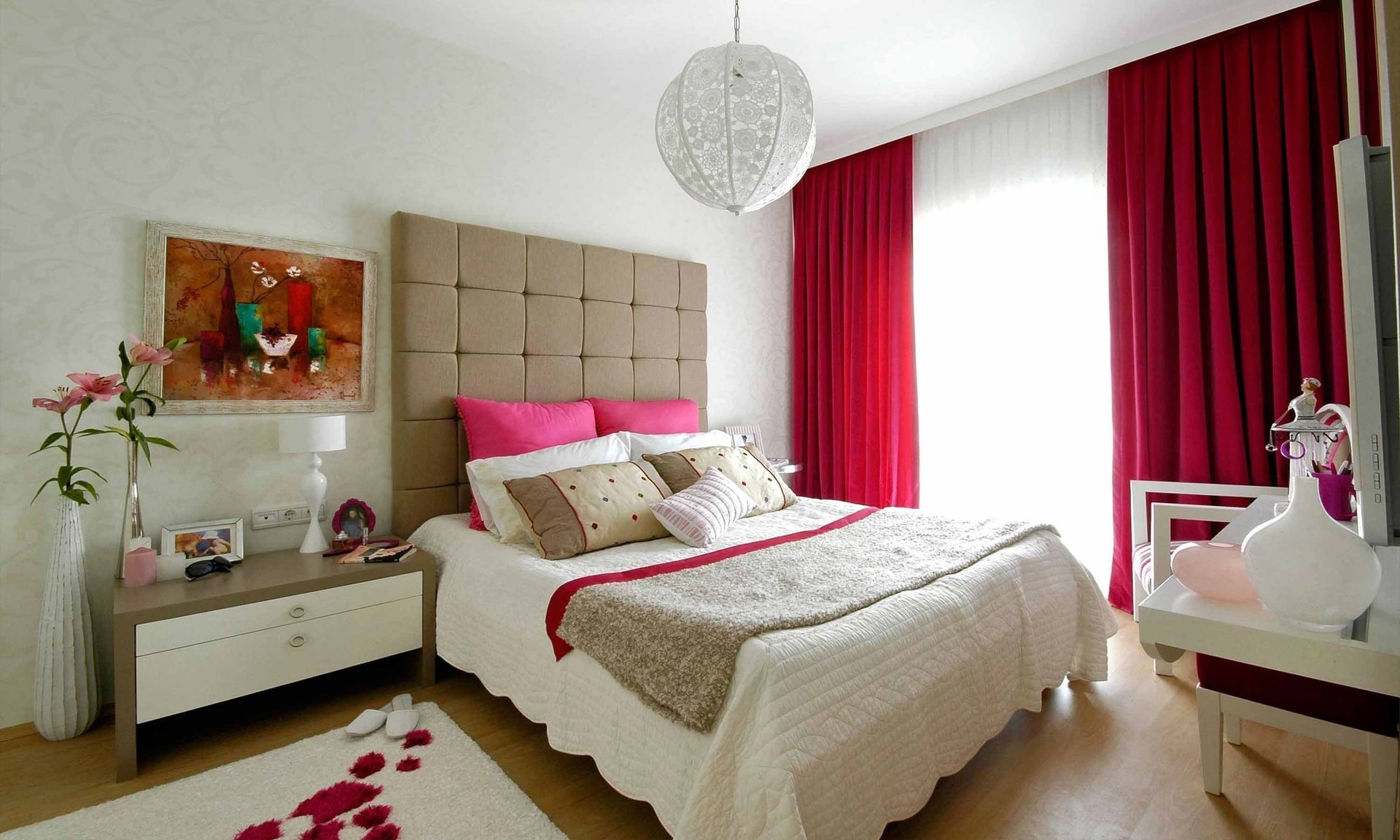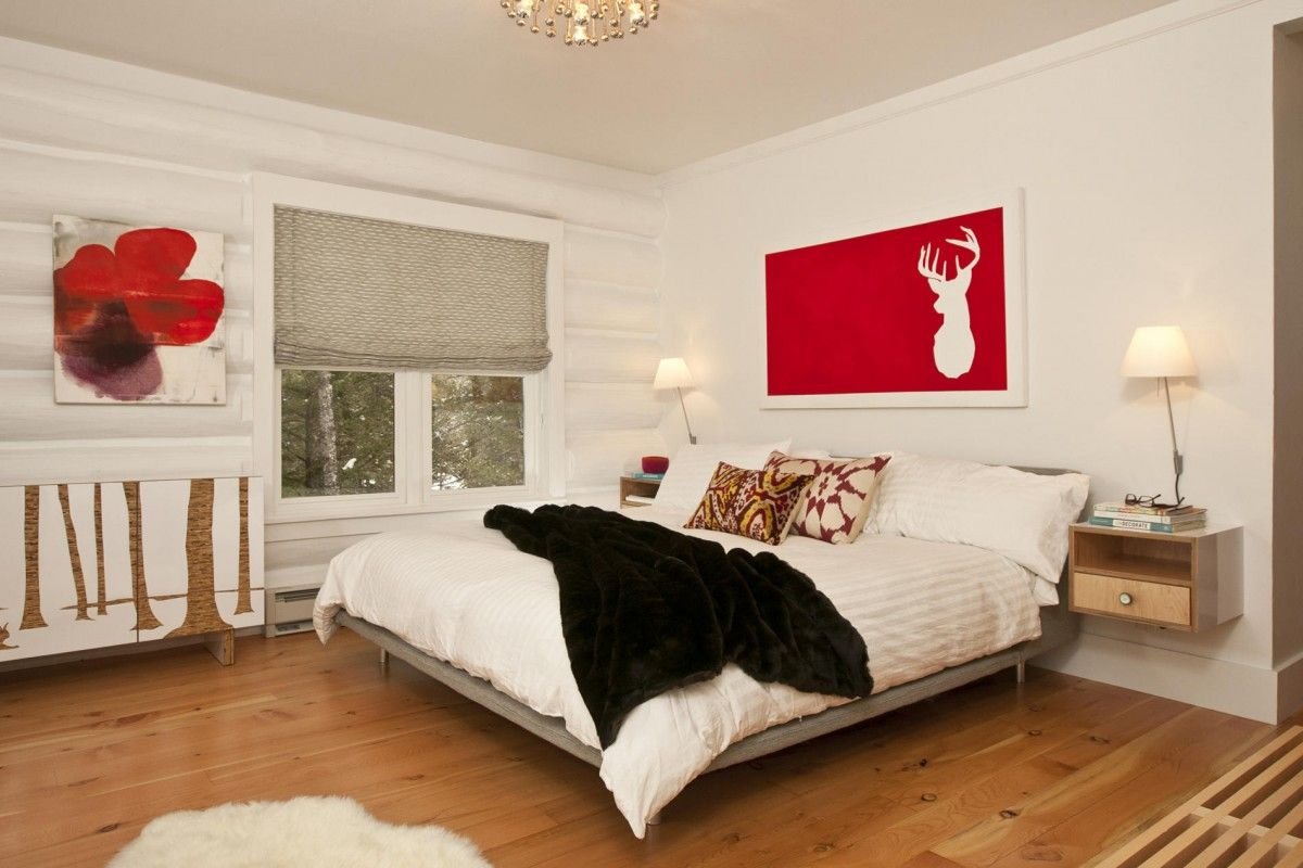 Белая спальня с красными акцентами