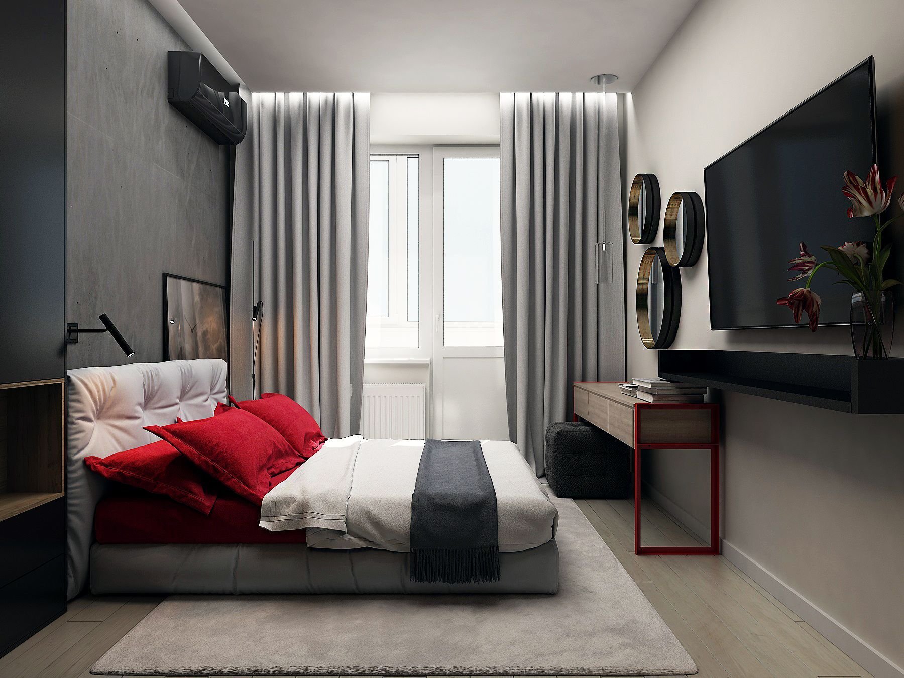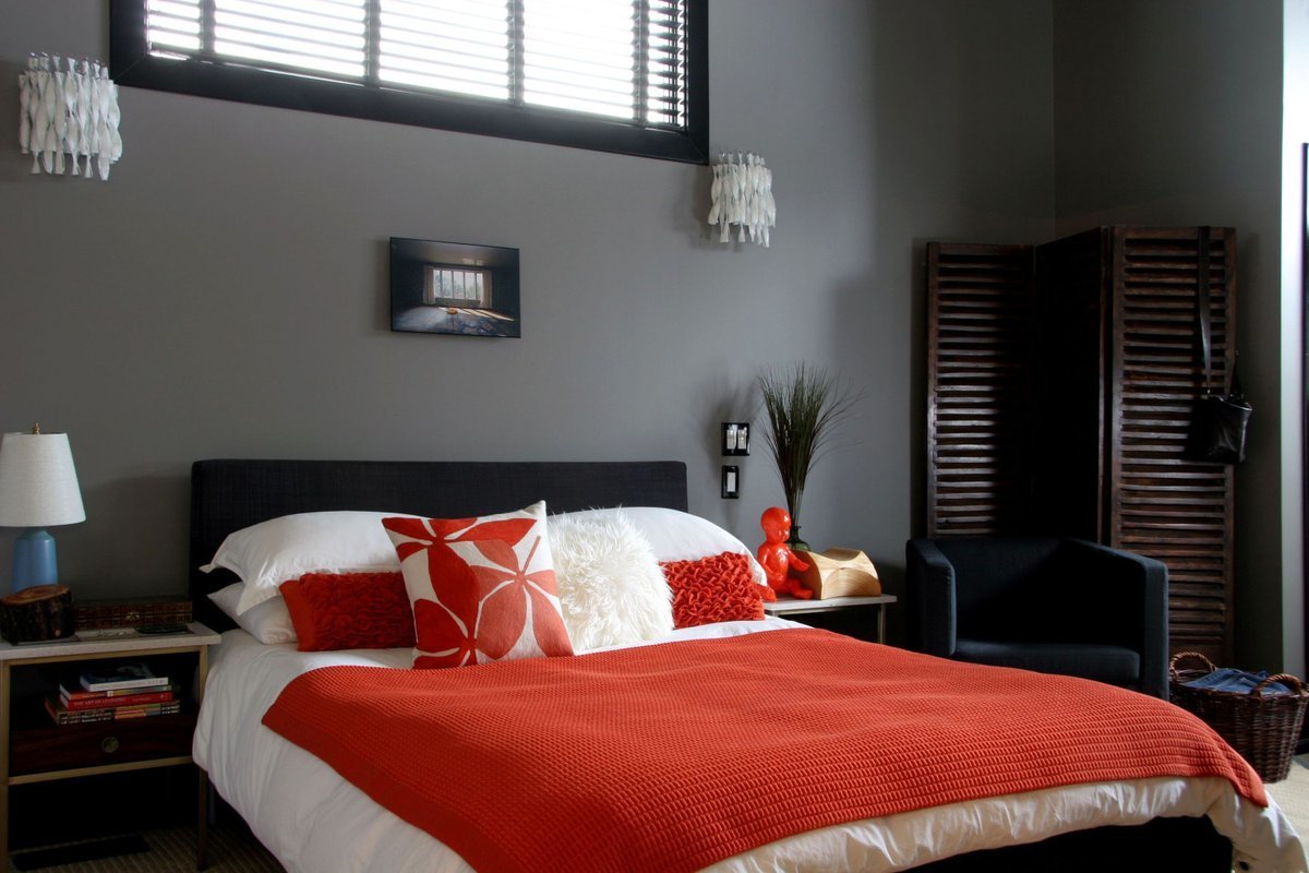 Серая спальня с красными акцентами
