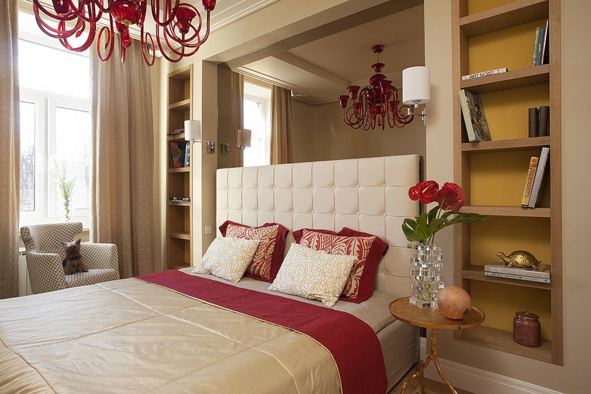 Спальня в золотистых тонах с красными элементами