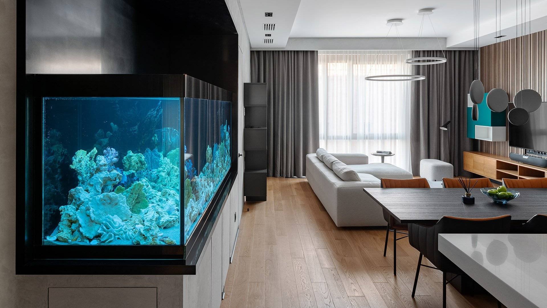 Интерьер гостиной с аквариумом в перегородке
