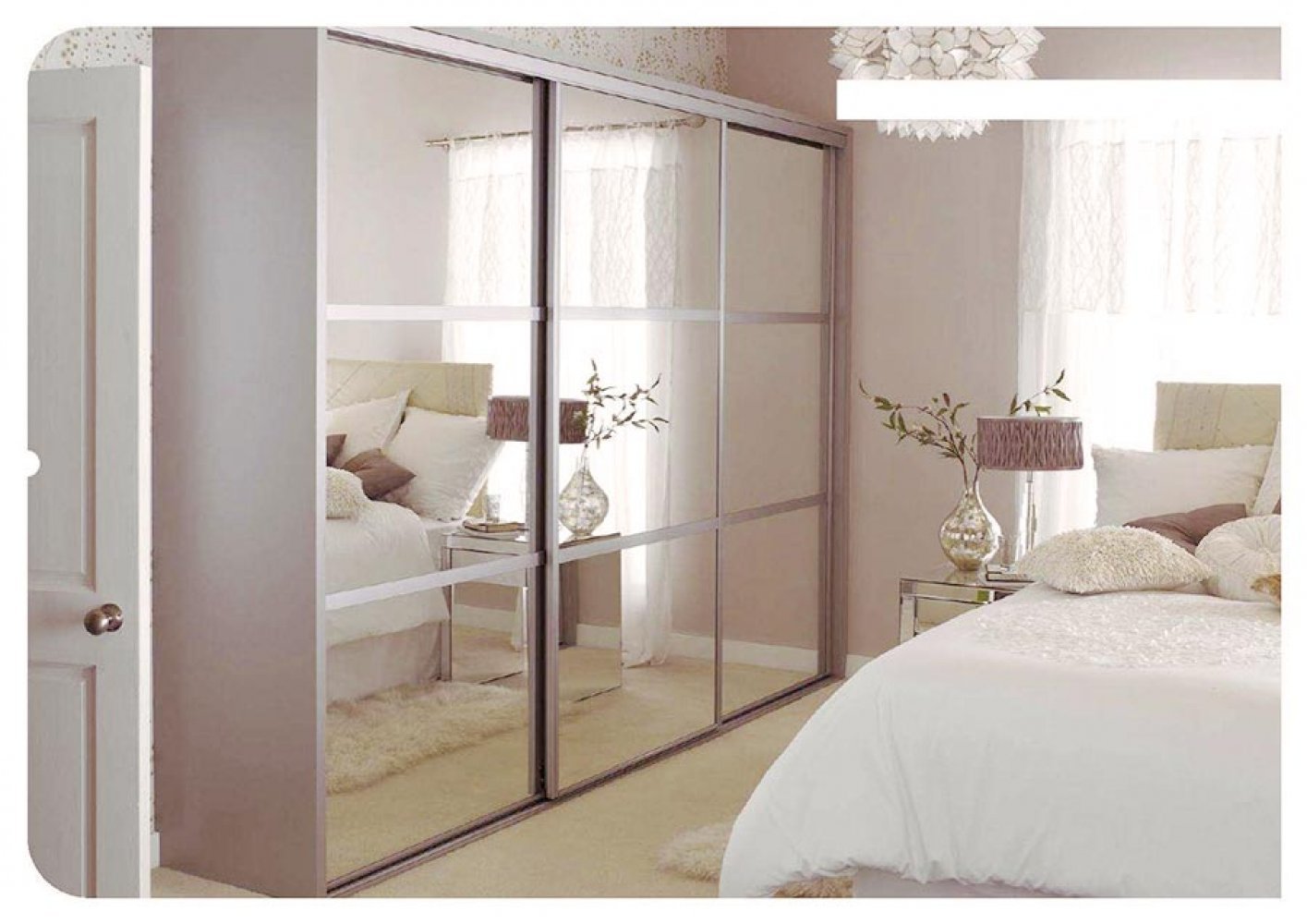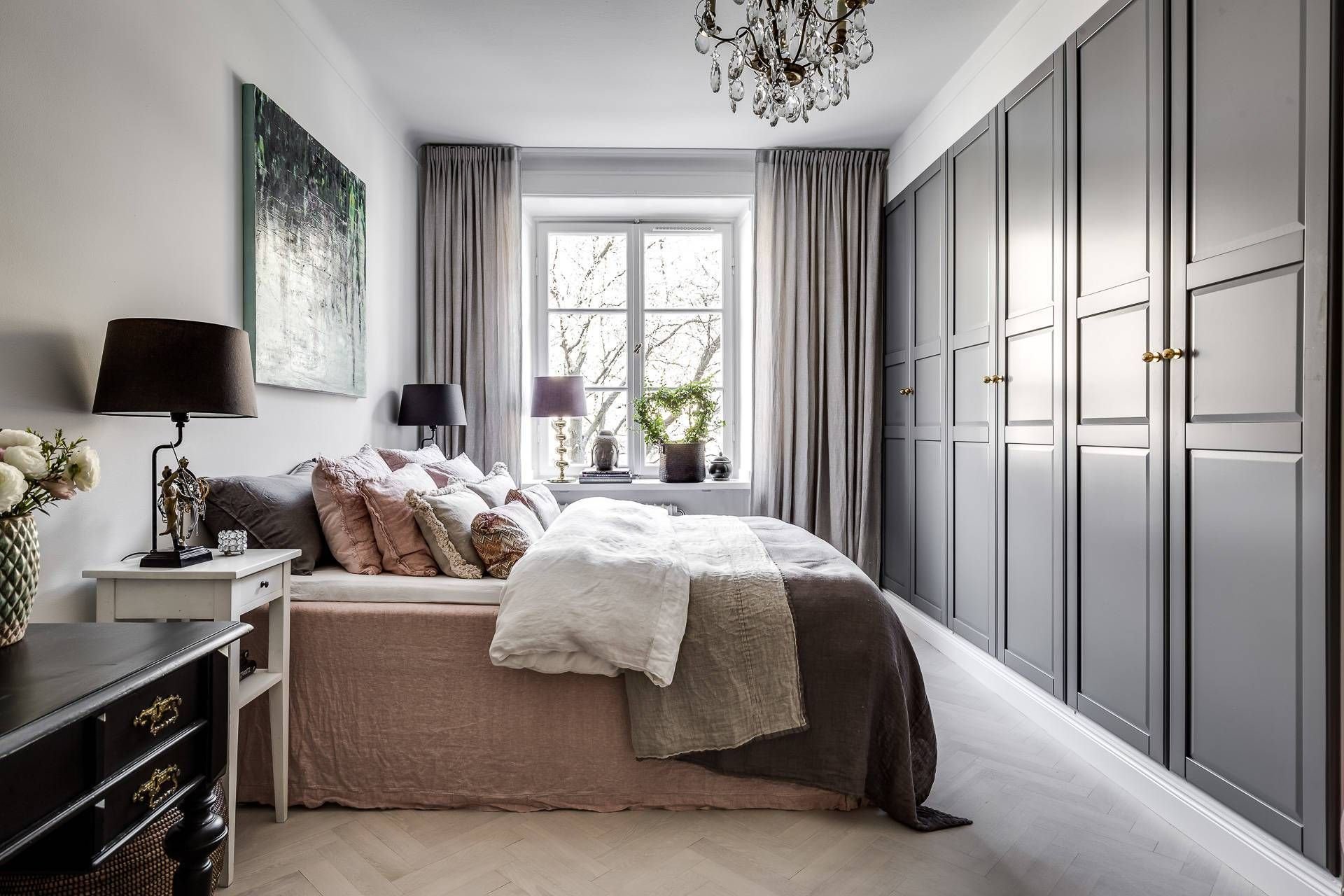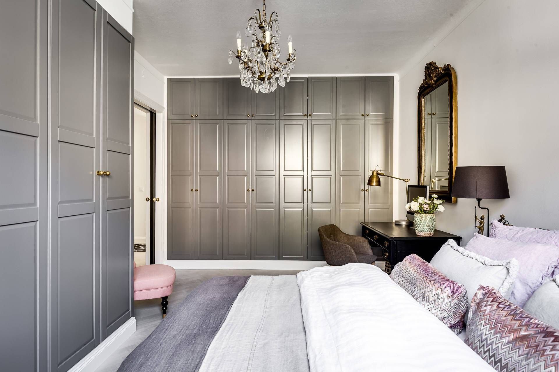 Спальня с пыльно розовыми шкафами