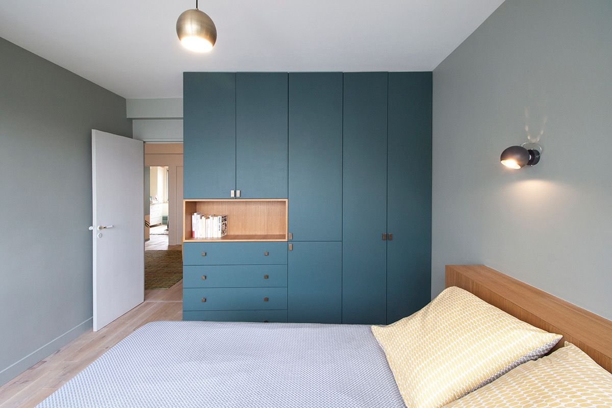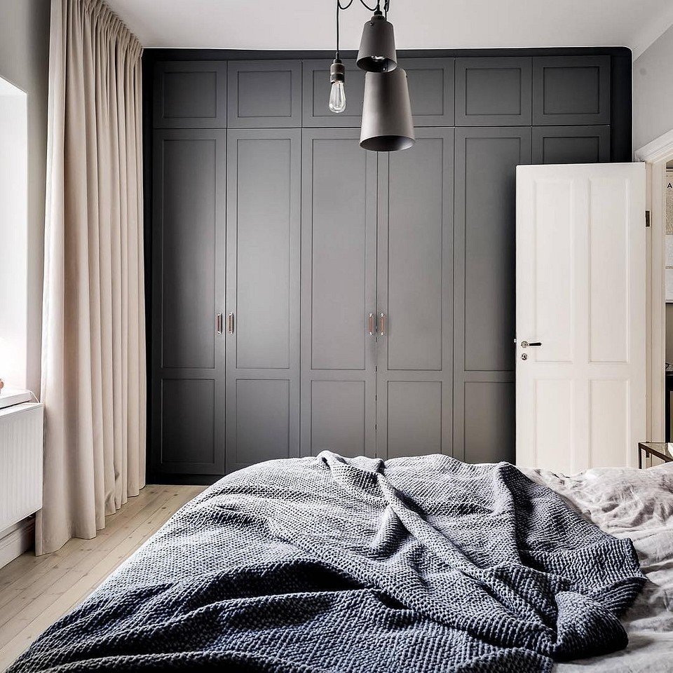 Серый шкаф в интерьере спальни