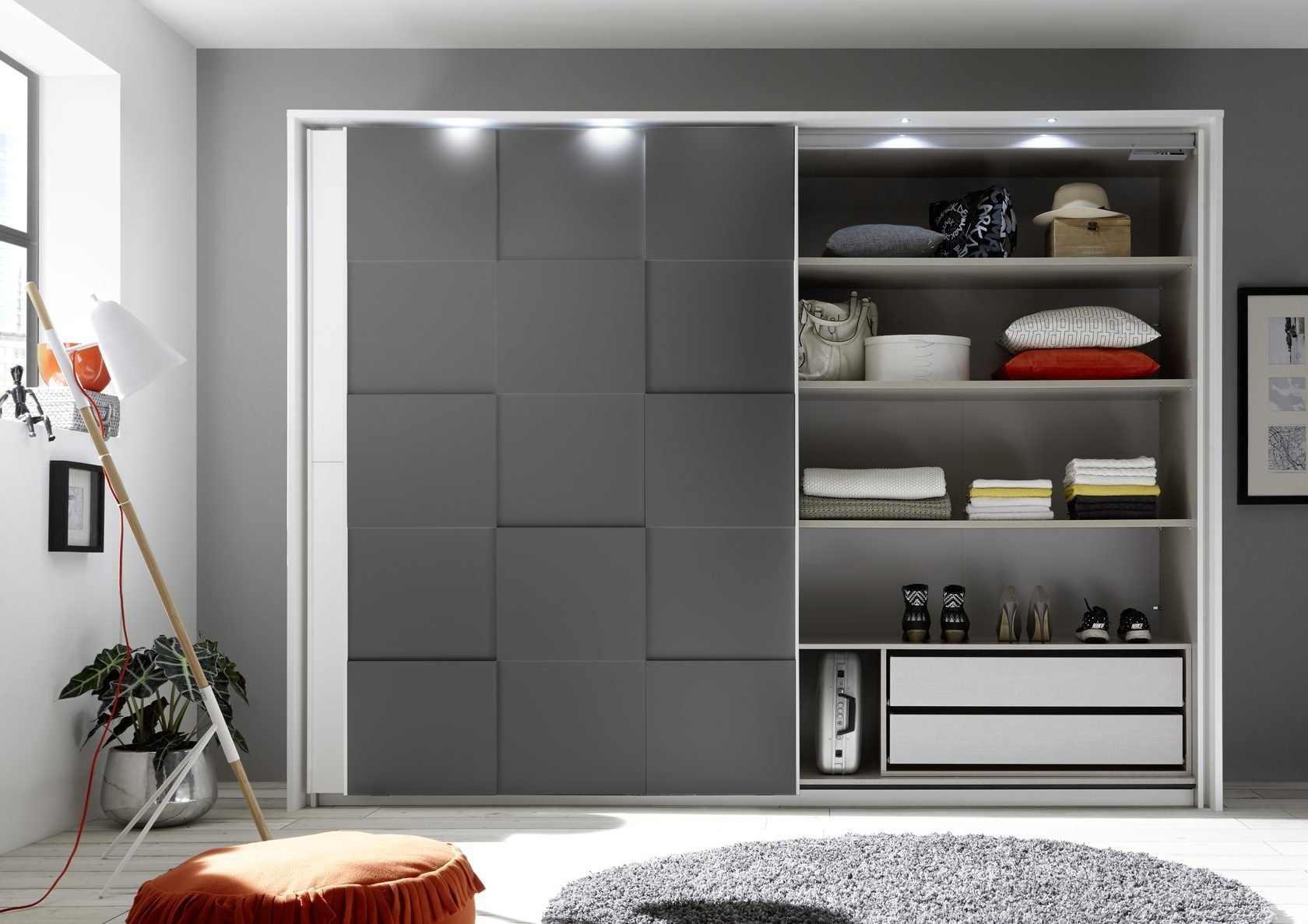 Серый шкаф в спальне