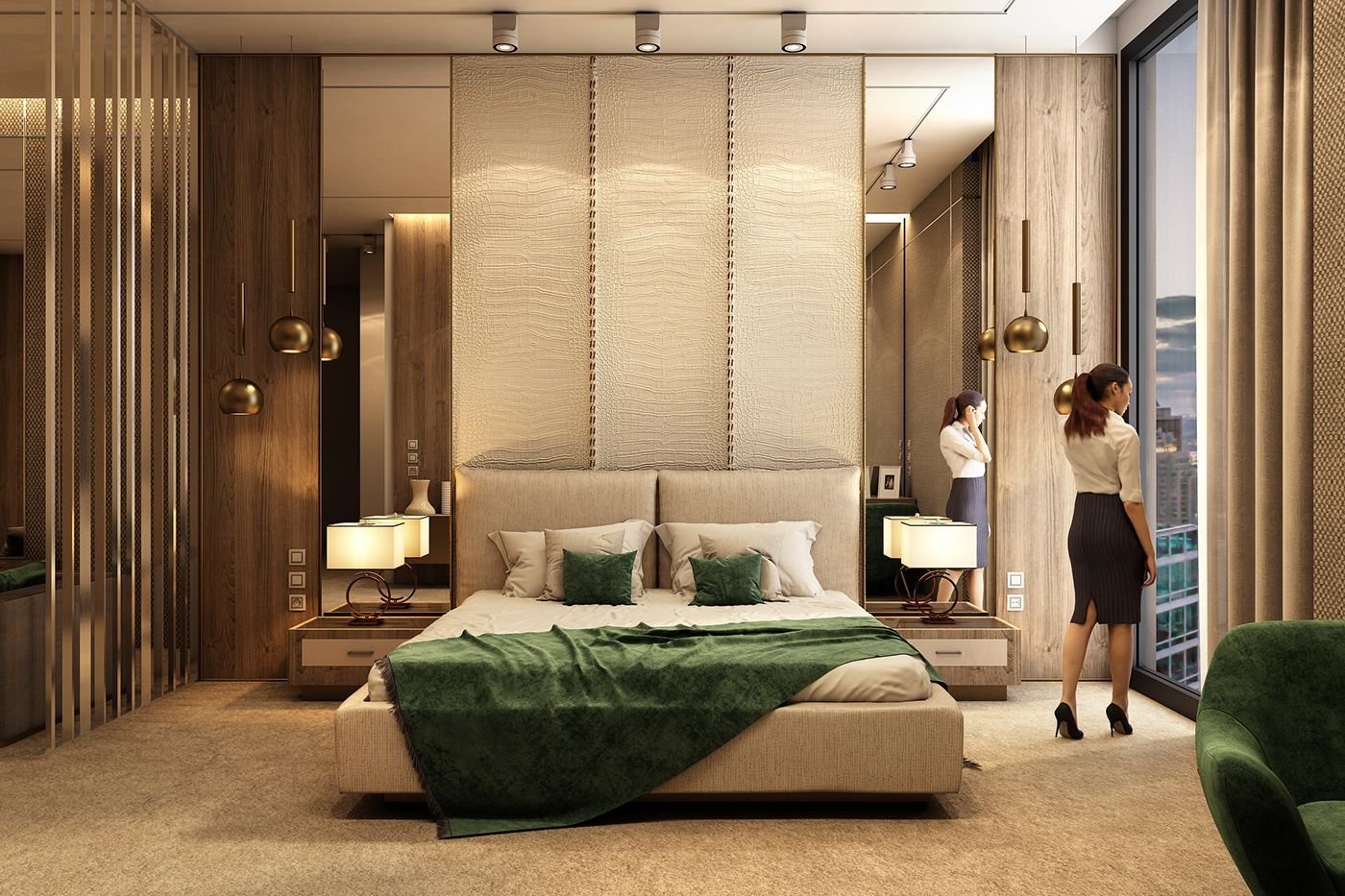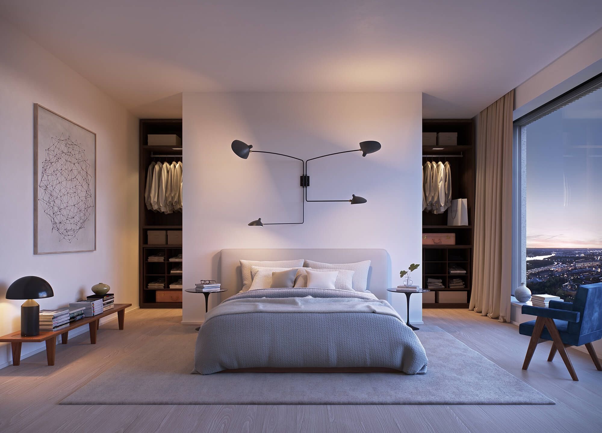 Спальня с панорамными окнами и гардеробной