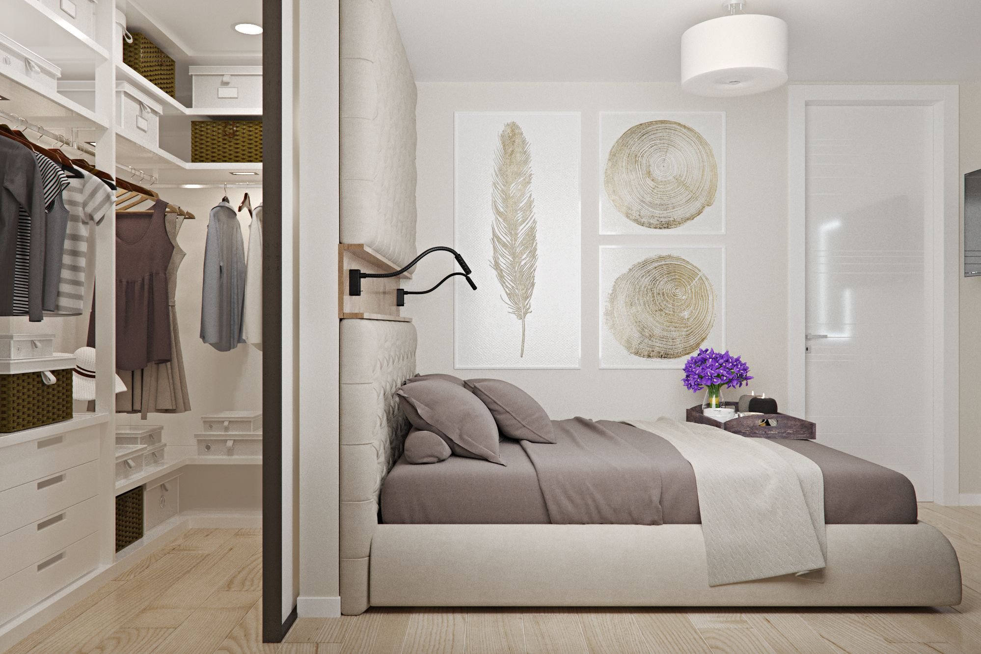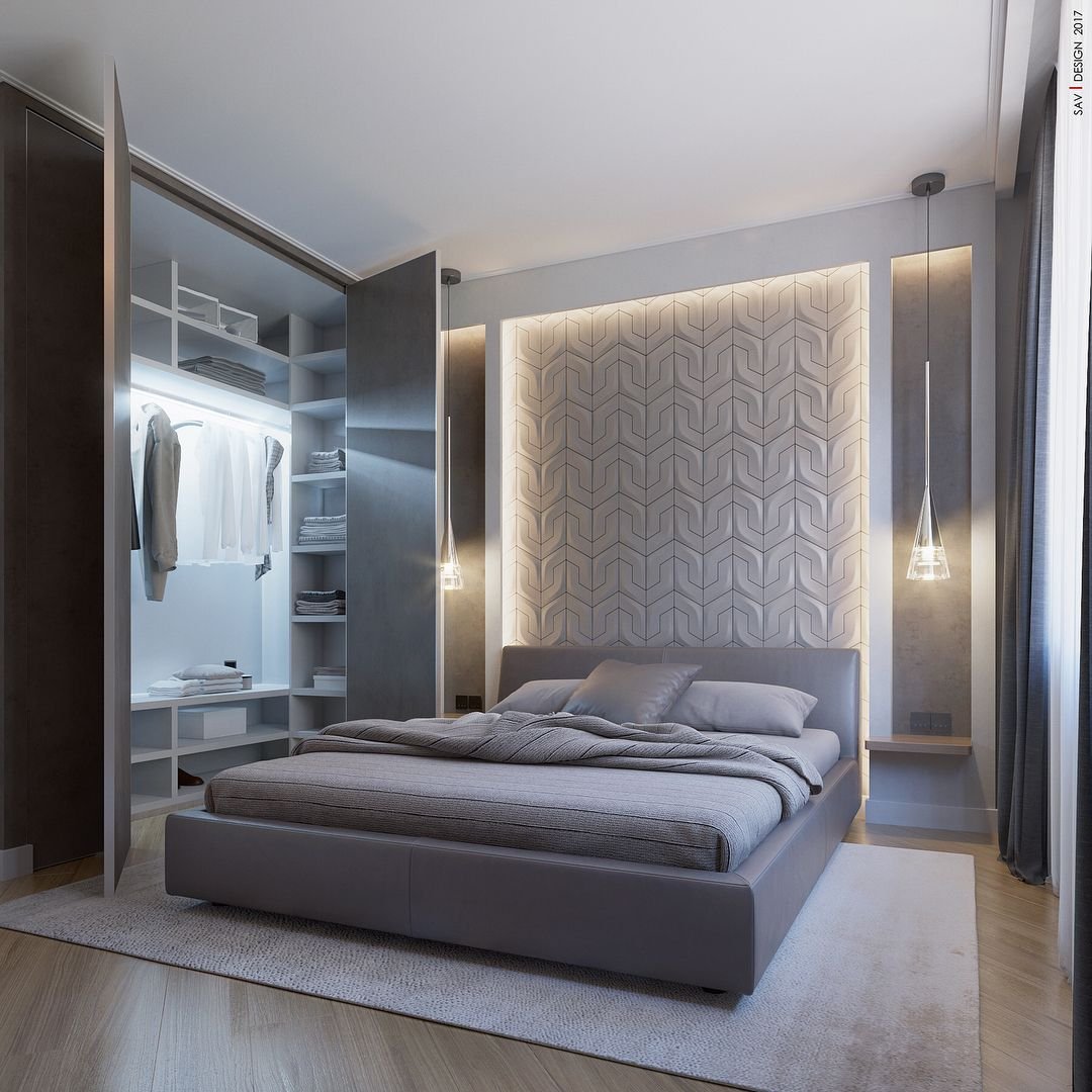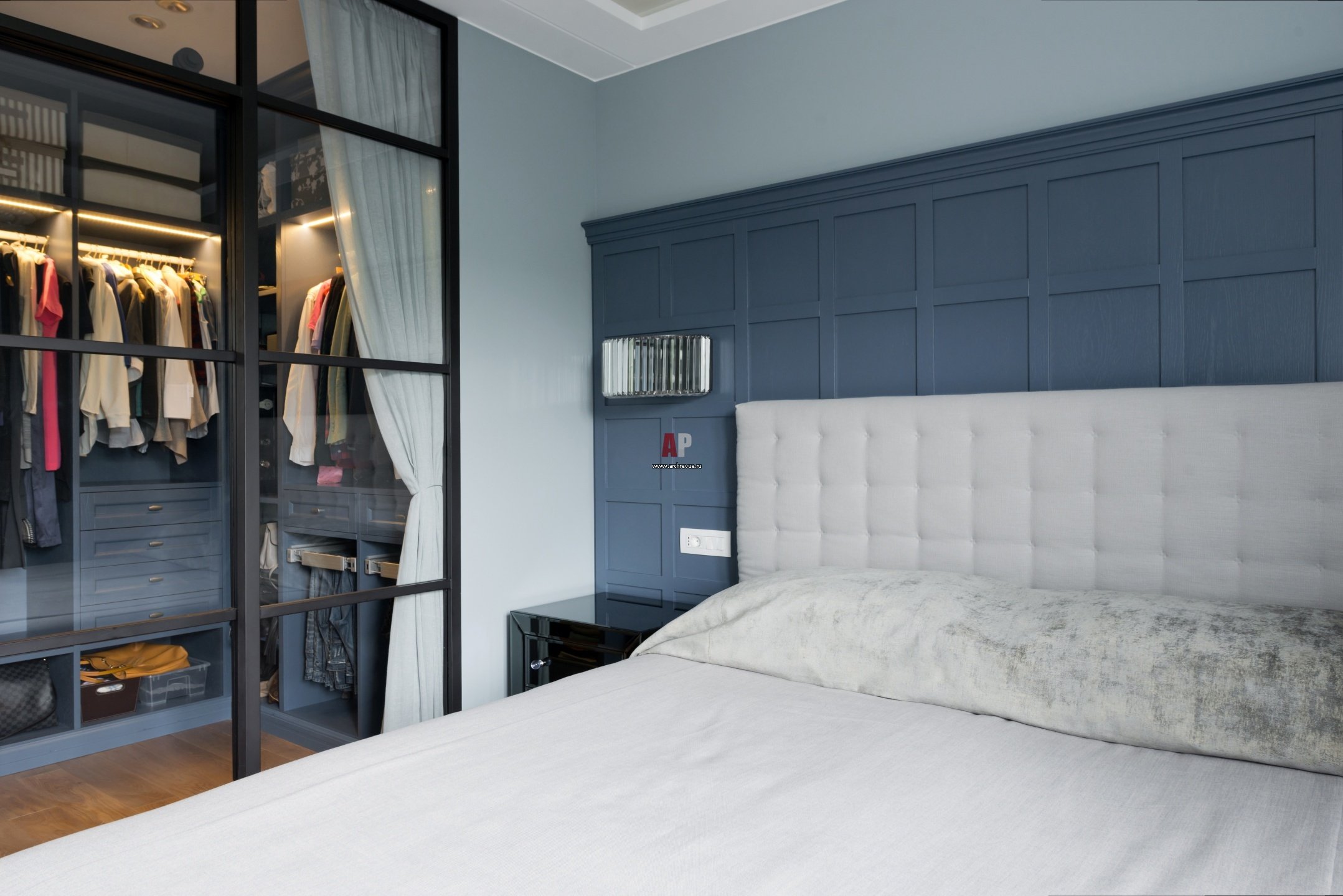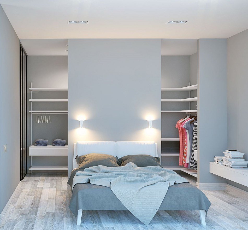 Спальня с гардеробной за изголовьем