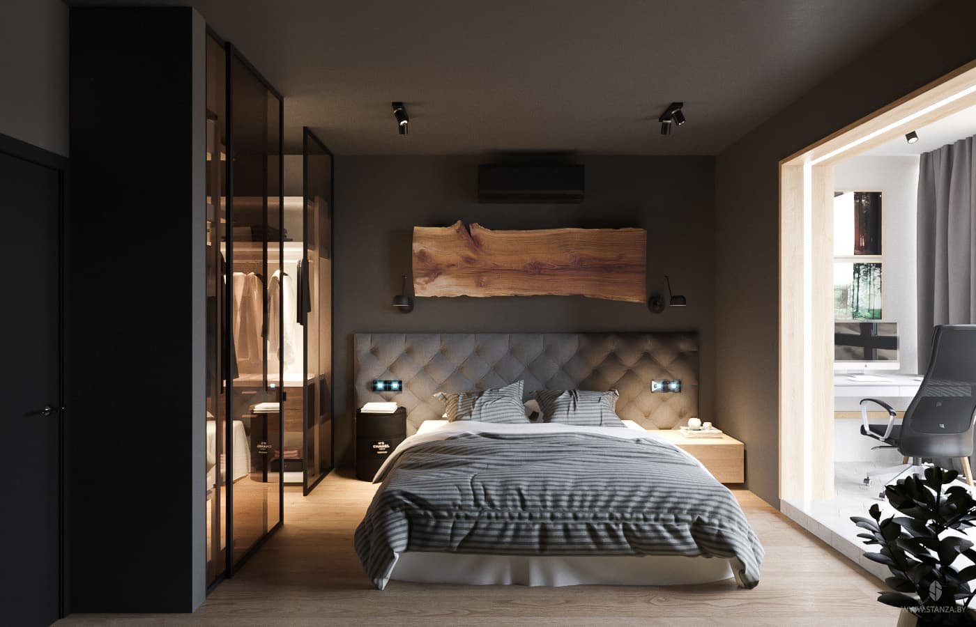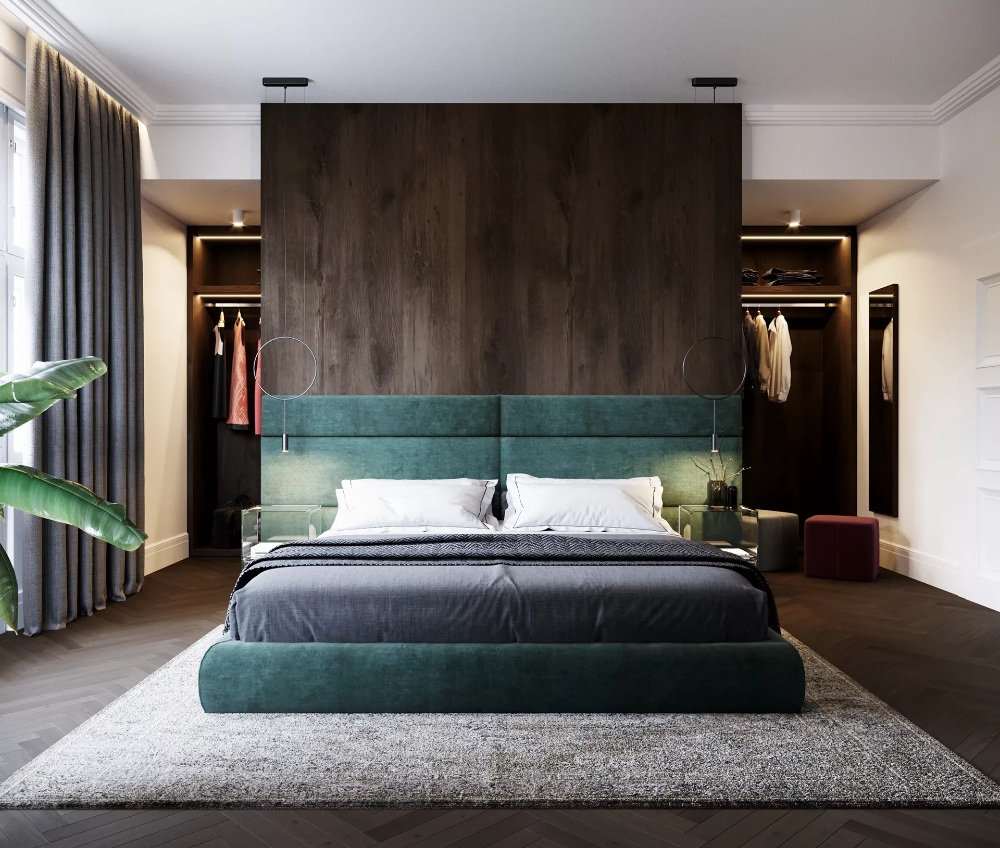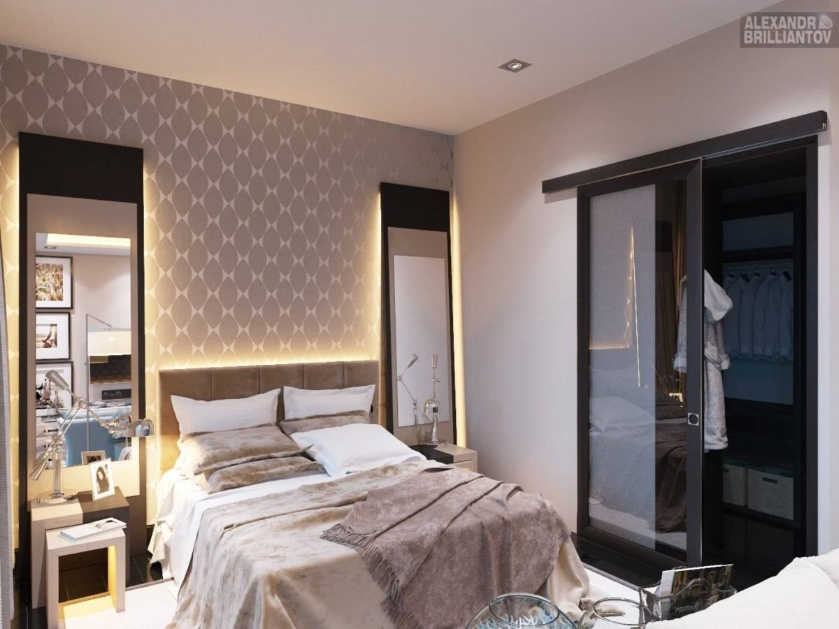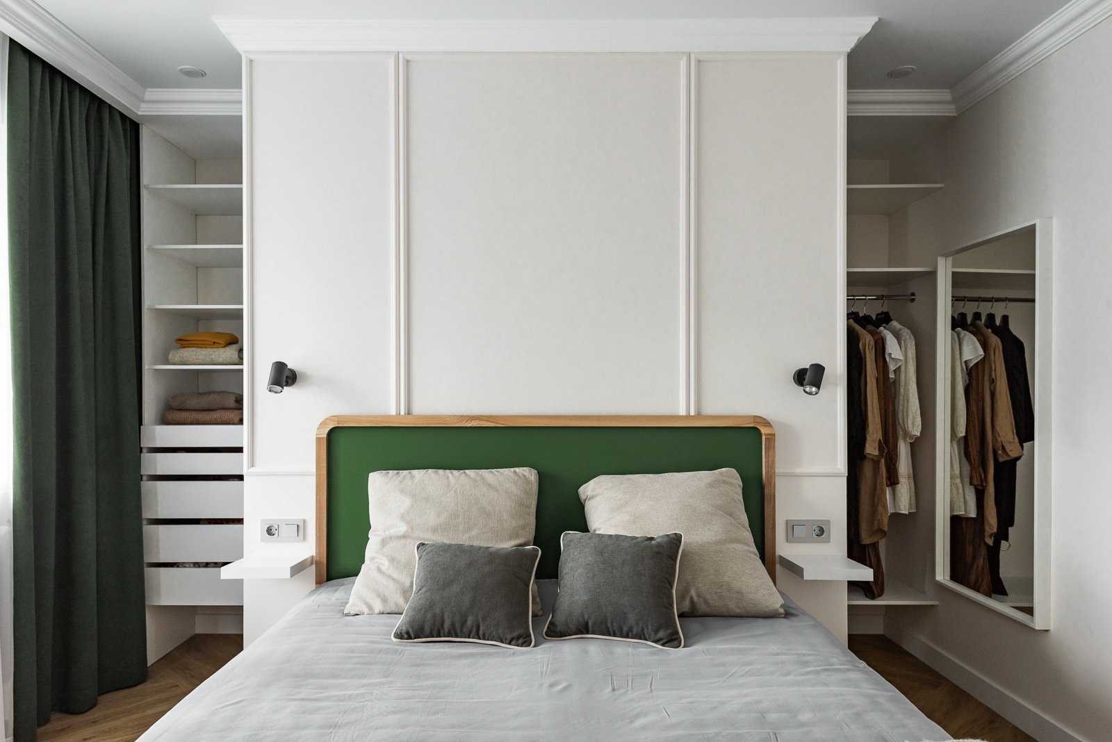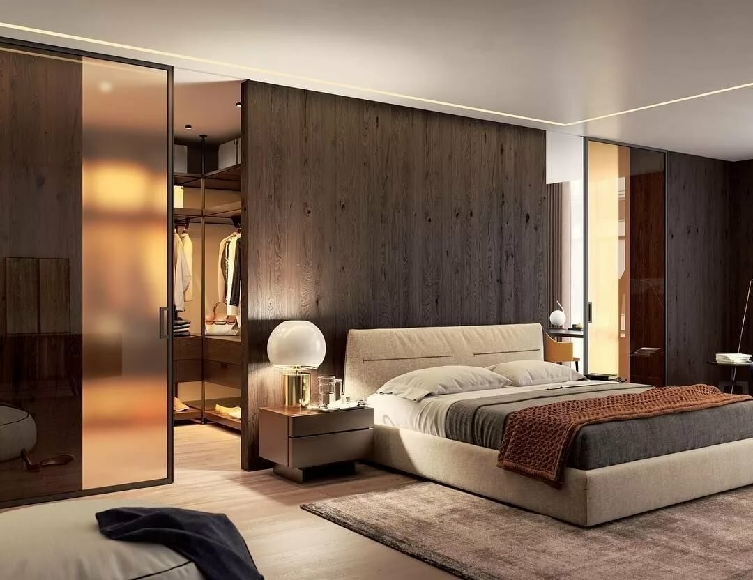 Спальня с гардеробной за изголовьем