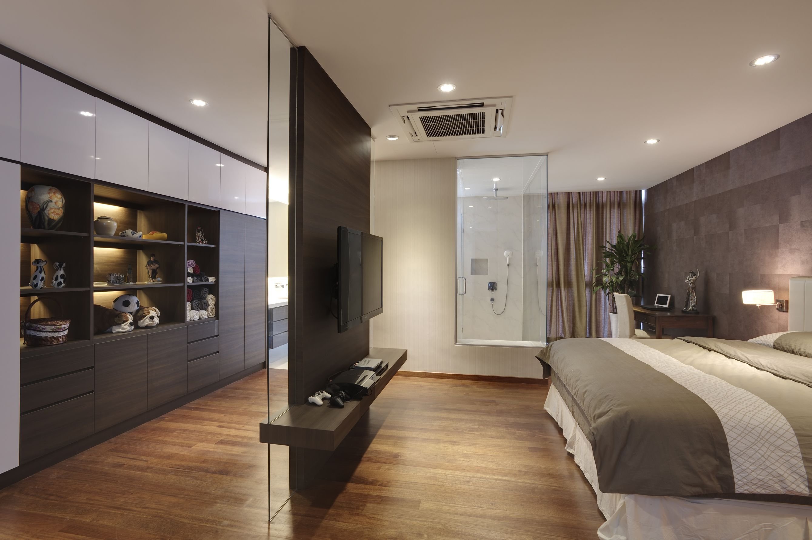 Спальня в современном стиле с ванной и гардеробной