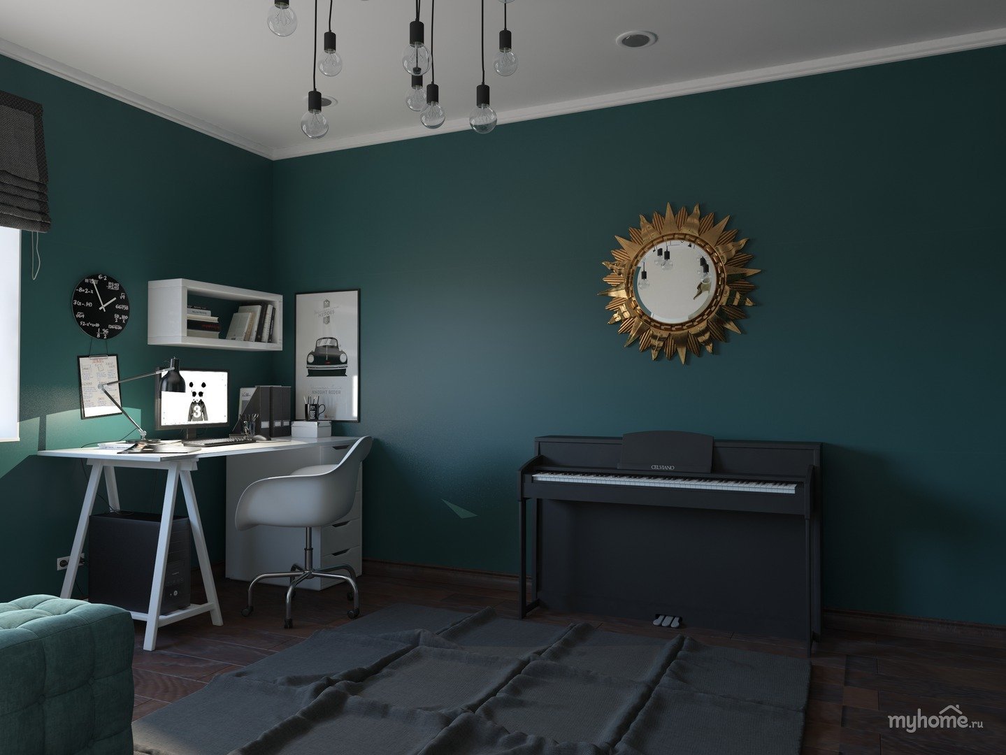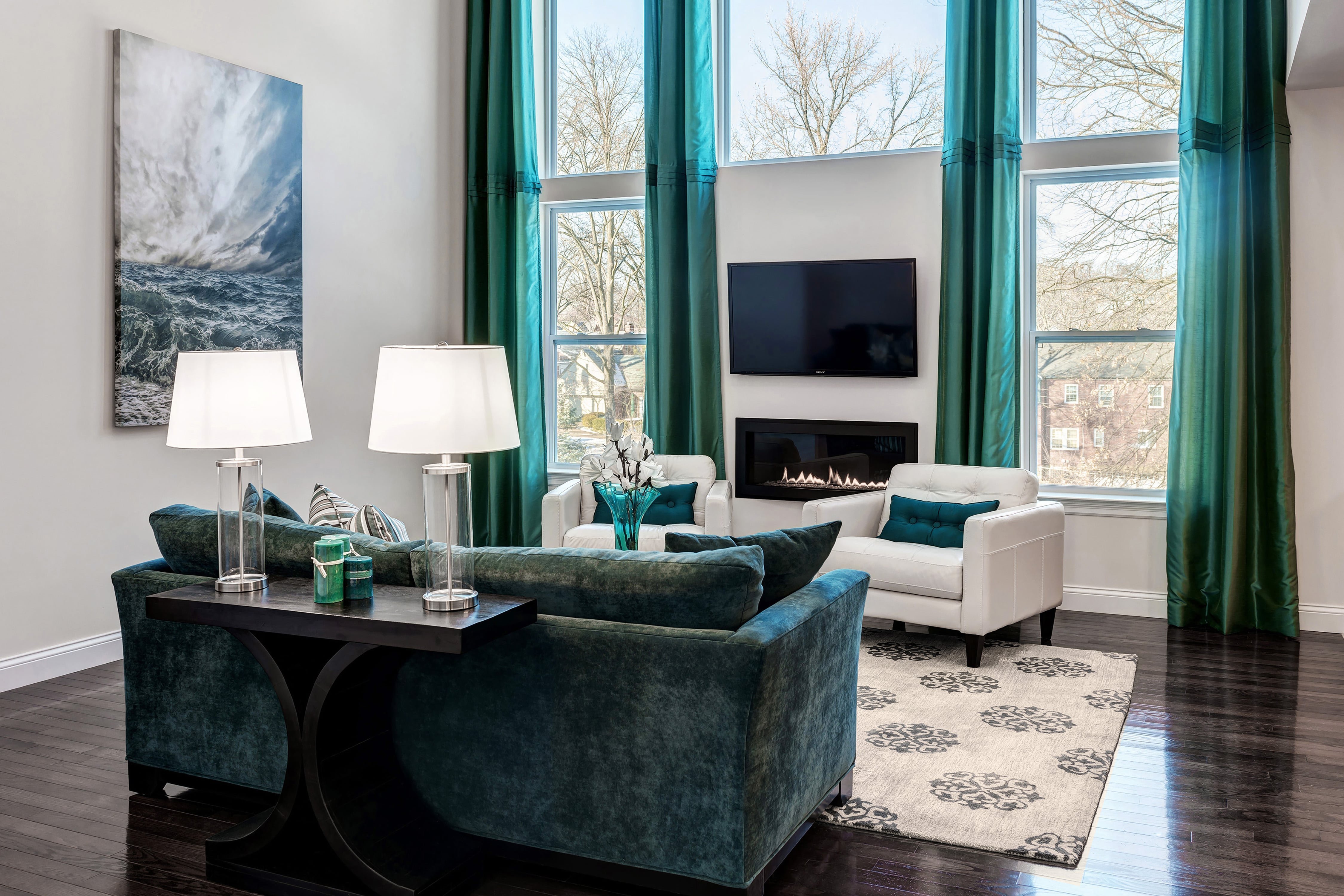 Бирюзовые стены в интерьере гостиной