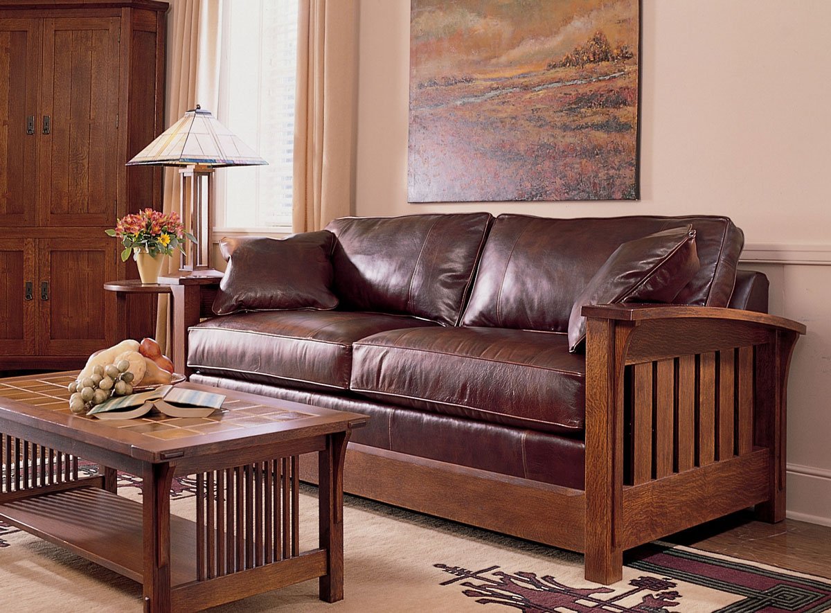 Кожаный диван с деревянными подлокотниками