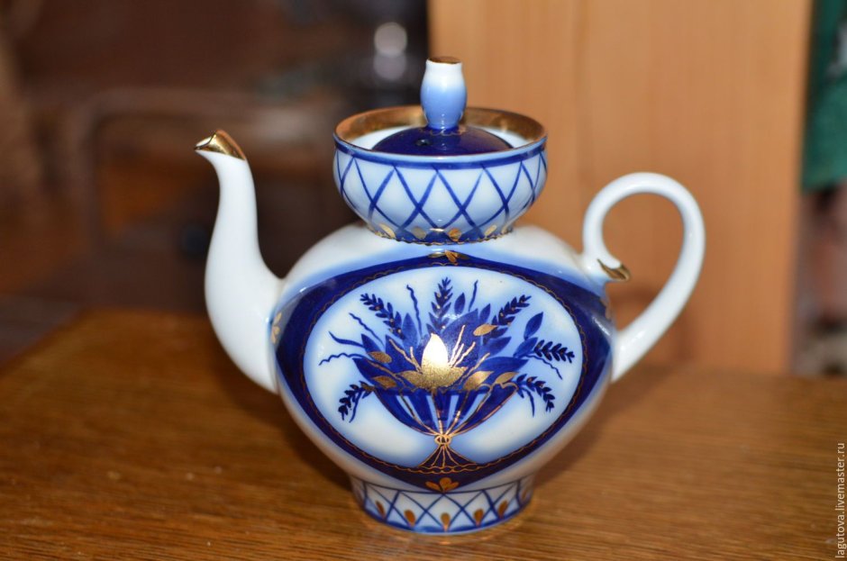 Гжель заварочный чайник кобальт с позолотой