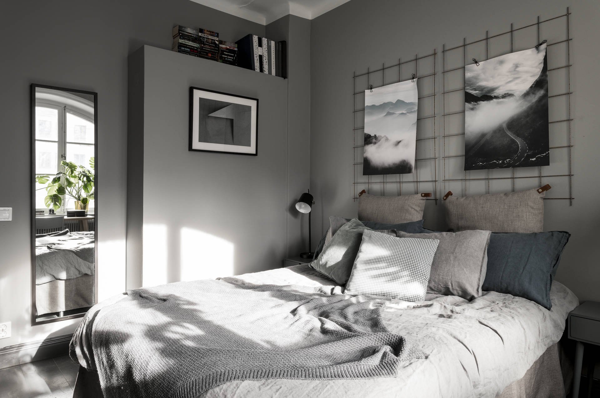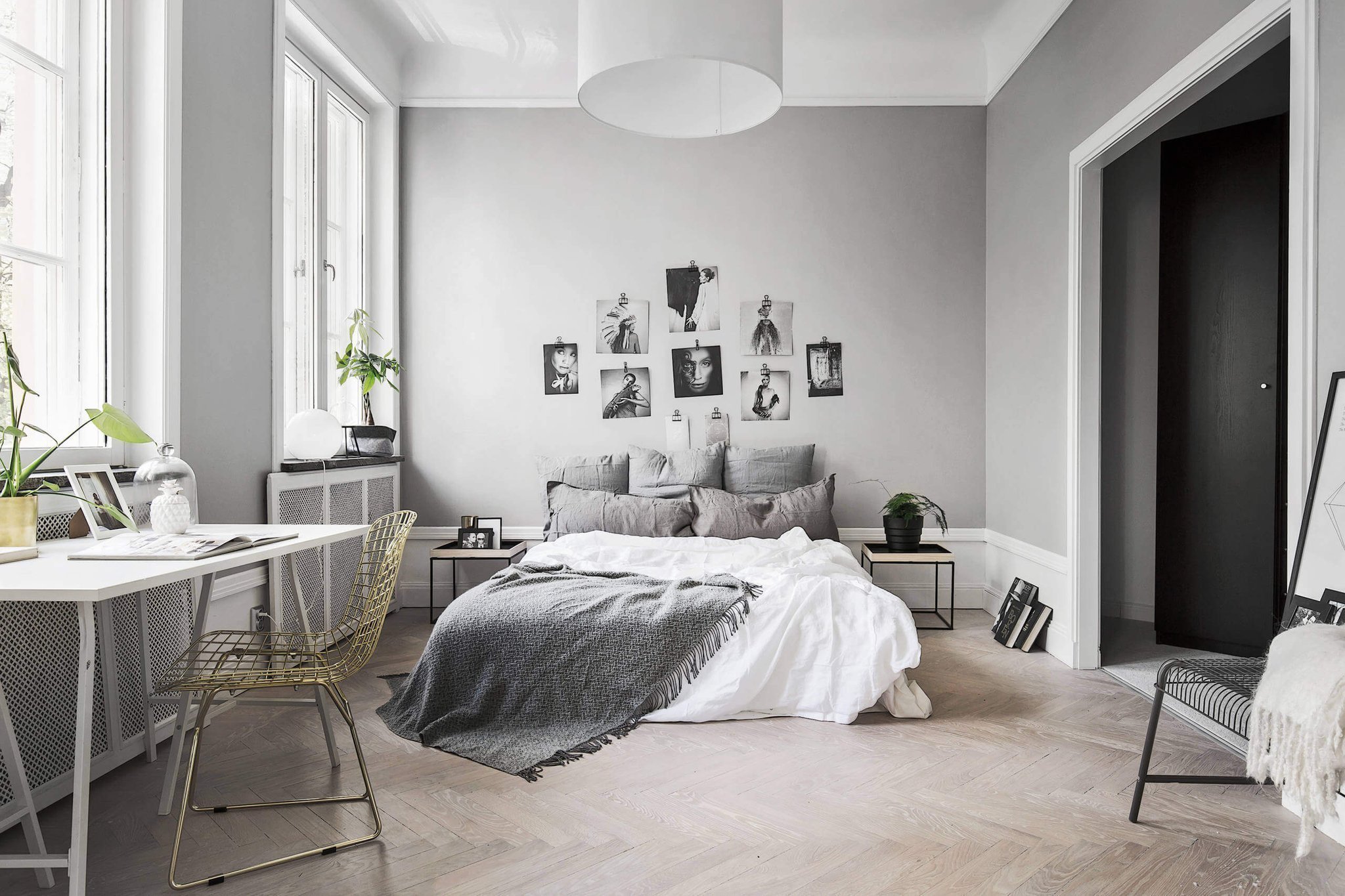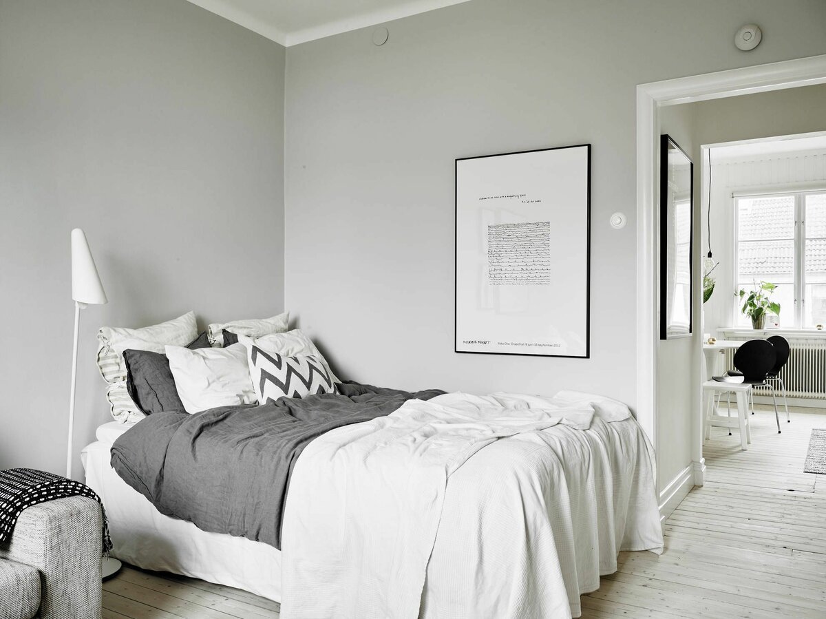 Спальня в скандинавском стиле с серыми стенами