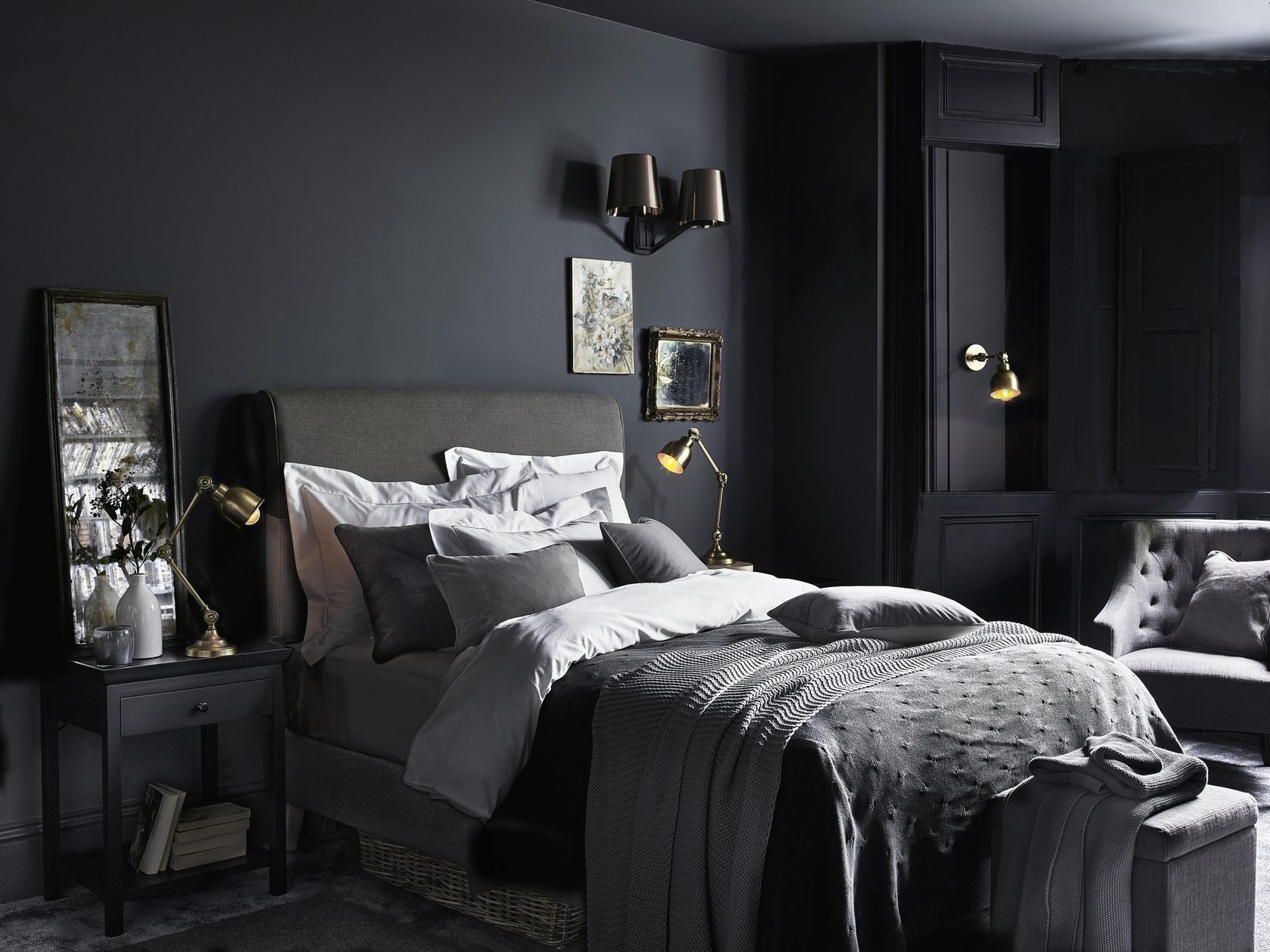 Спальня с темными стенами