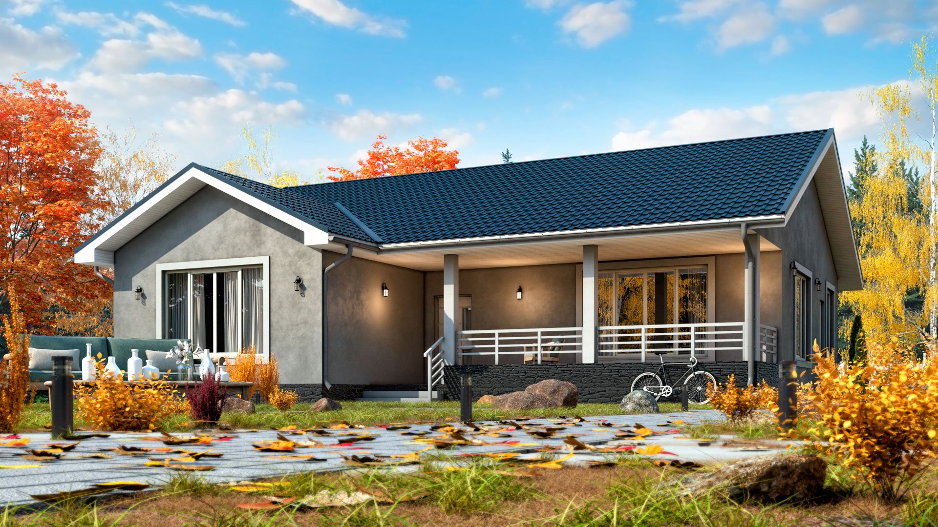 Каркасный одноэтажный дом с террасой под ключ