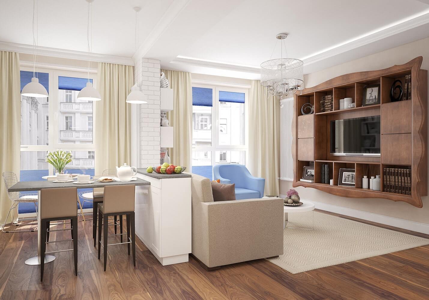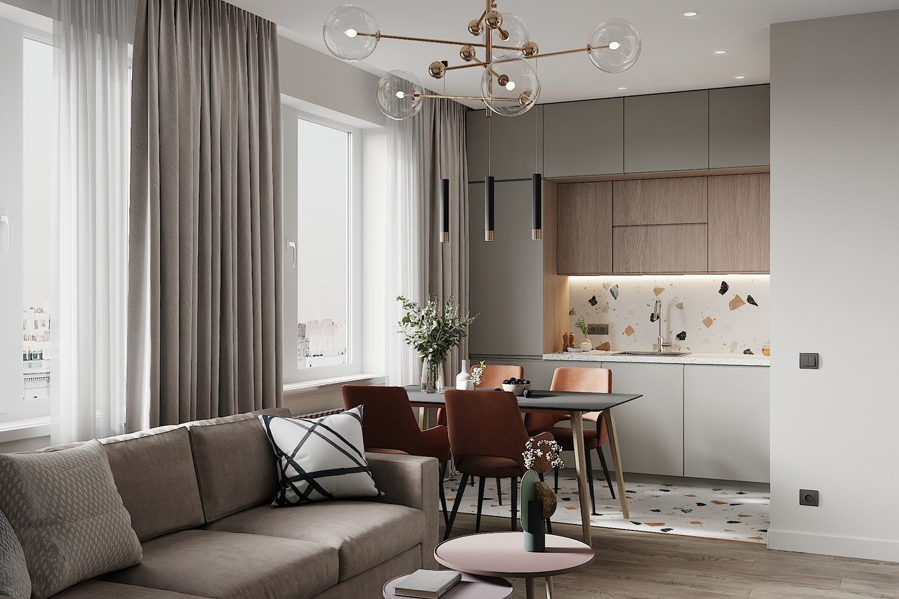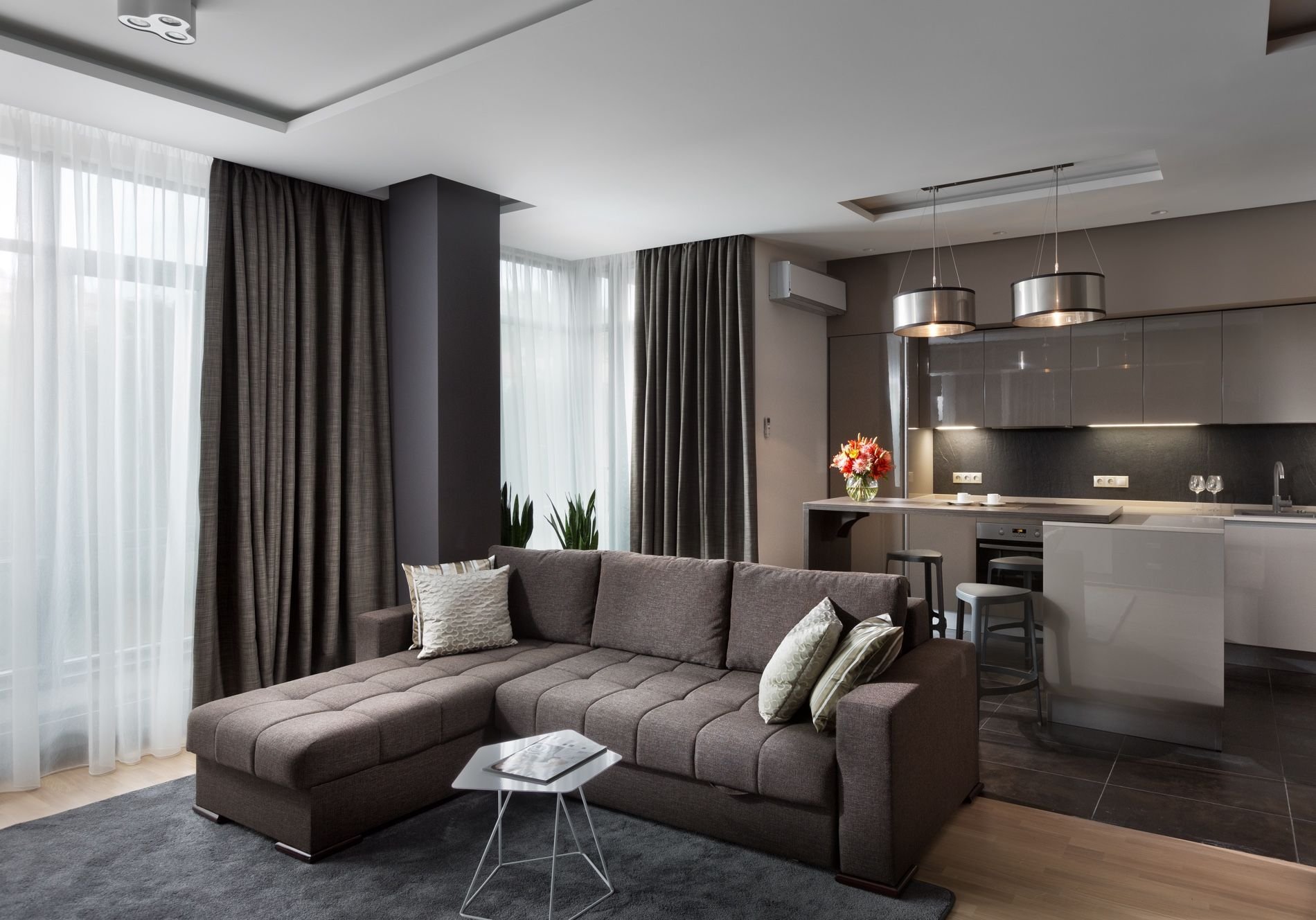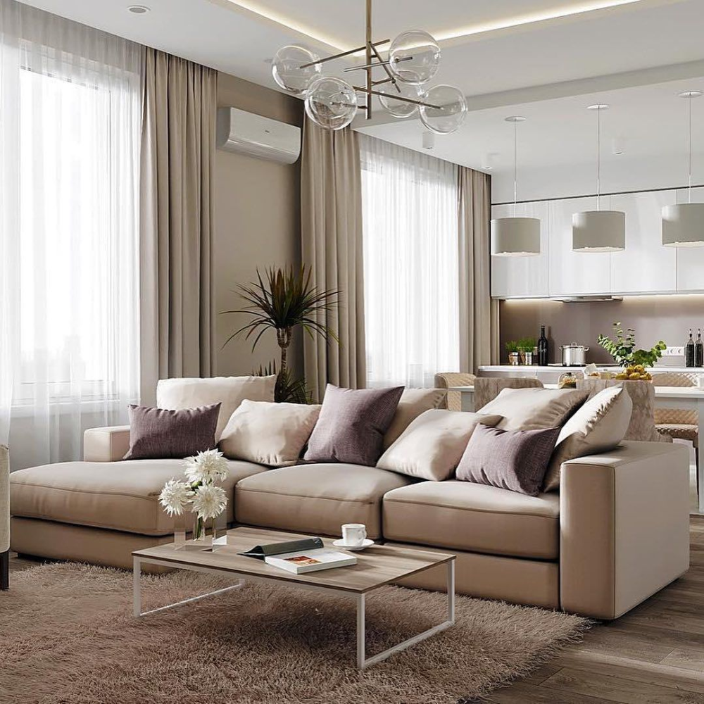 Шторы в гостиную совмещенную с кухней