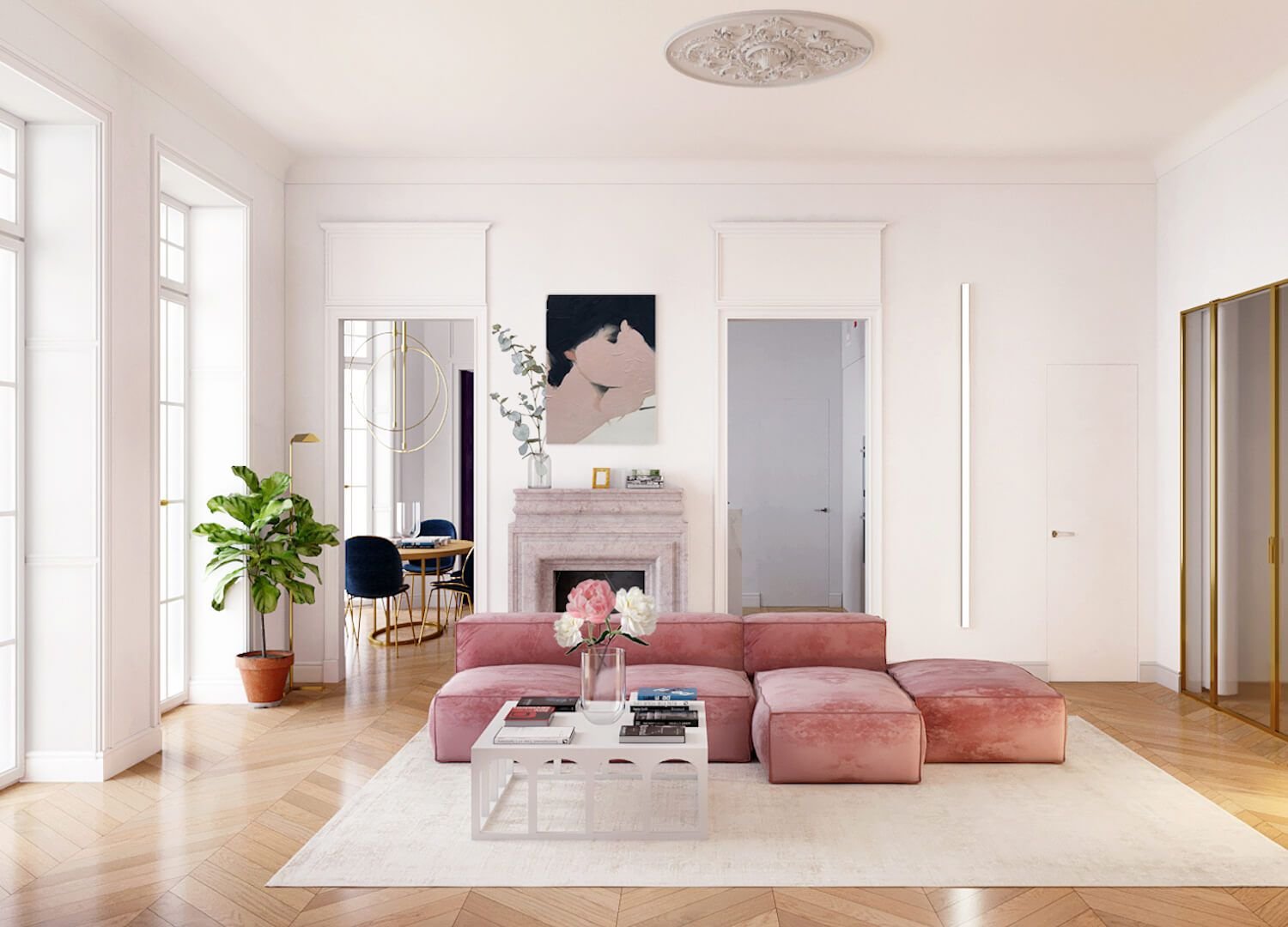 Розовый диван в классическом интерьере гостиной