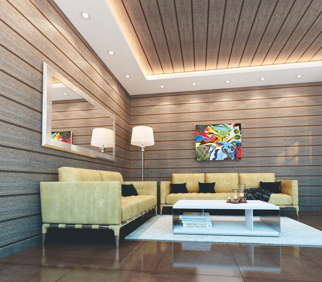 Ламинат на стену и потолок в гостиной