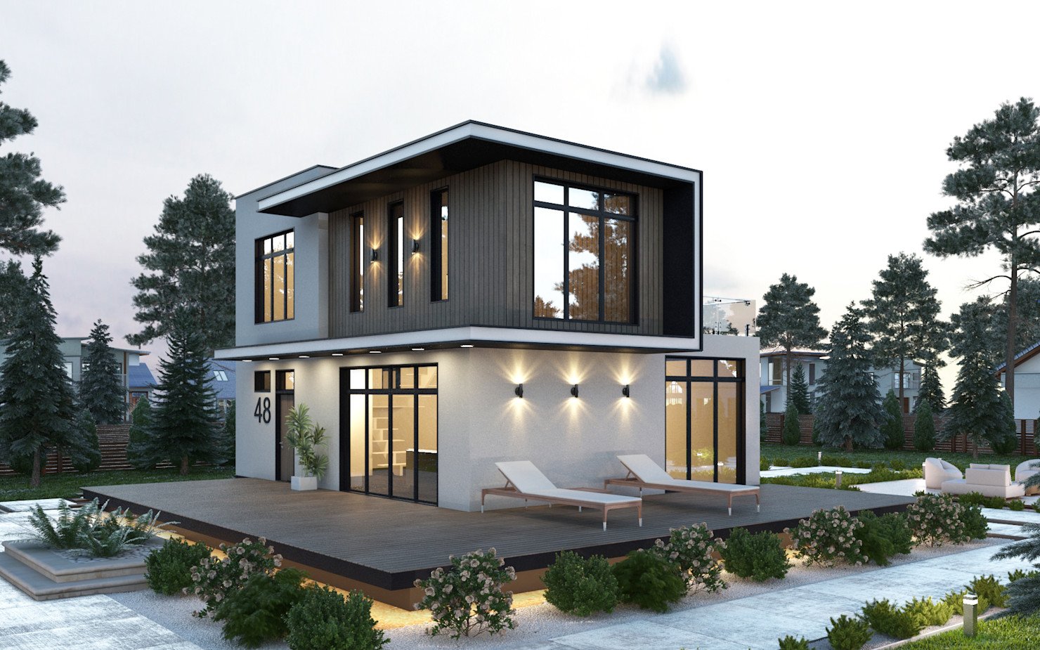 Двухэтажный дом с плоской крышей и панорамными окнами