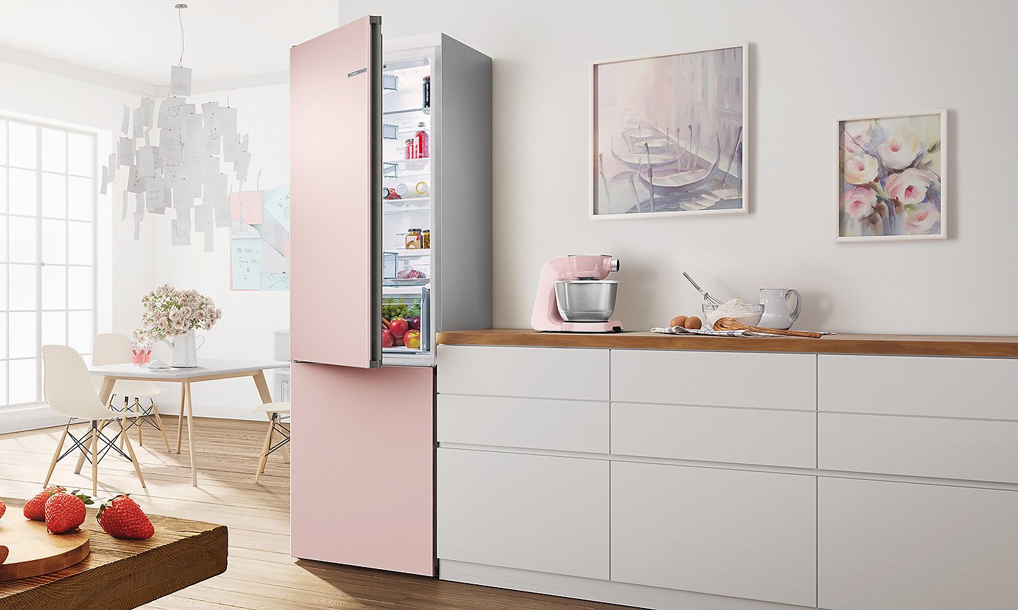 Розовый холодильник в интерьере кухни
