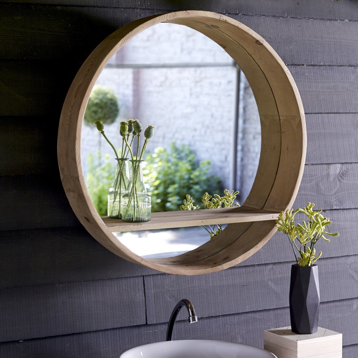Круглое зеркало в деревянной раме для ванной