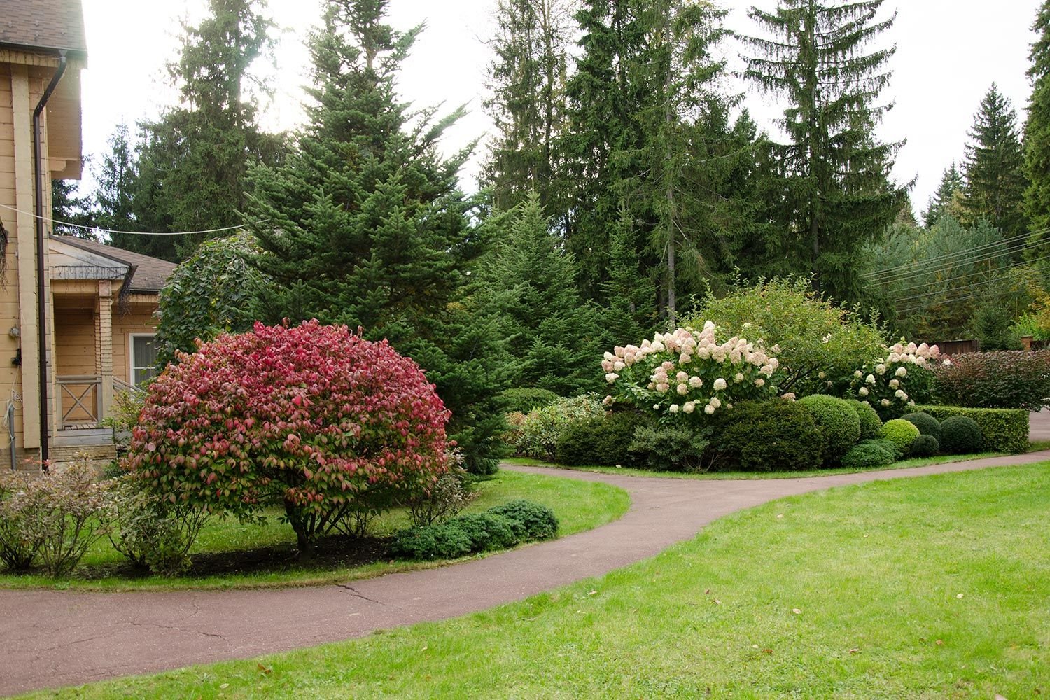Миксбордер с елью и спиреей