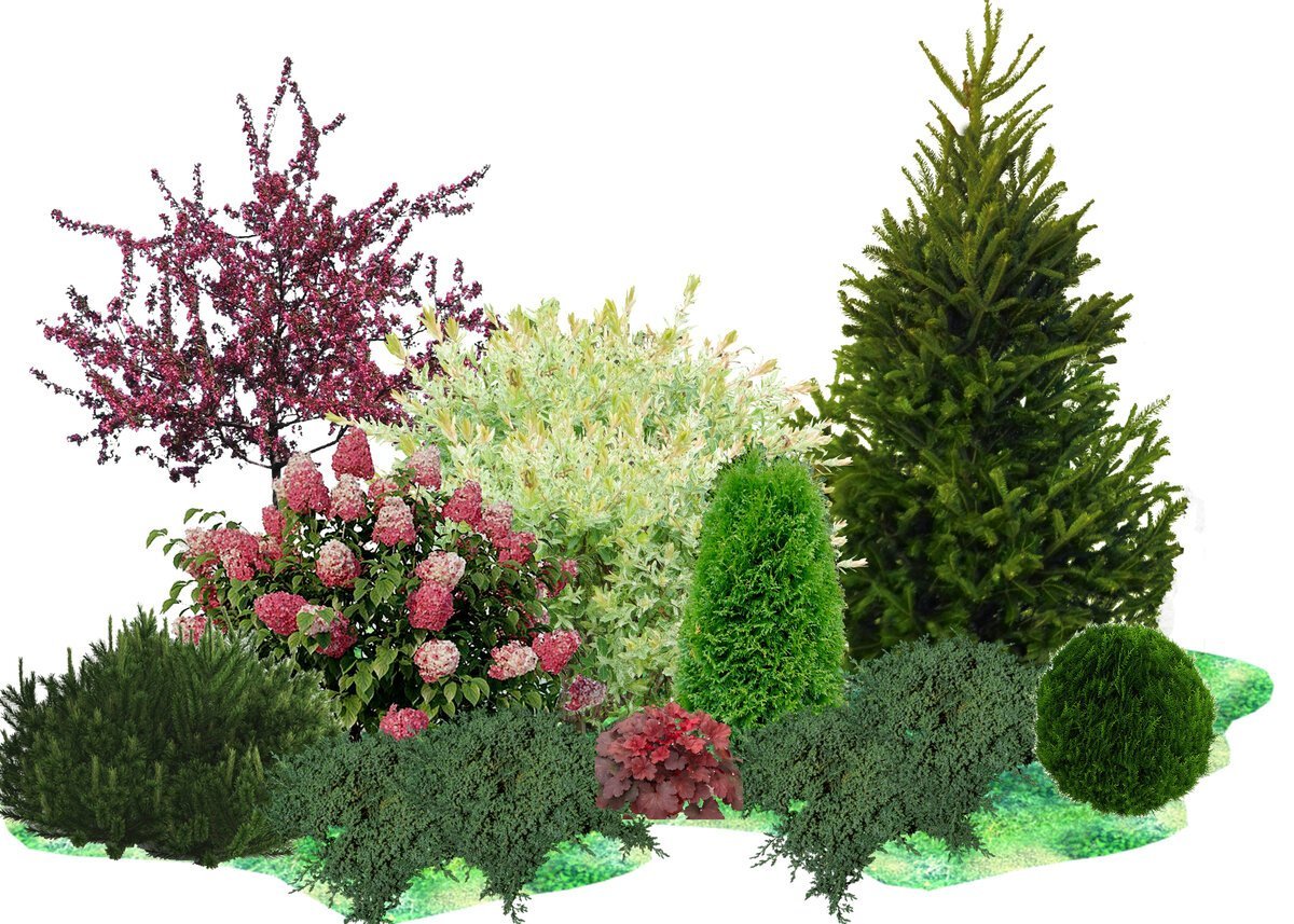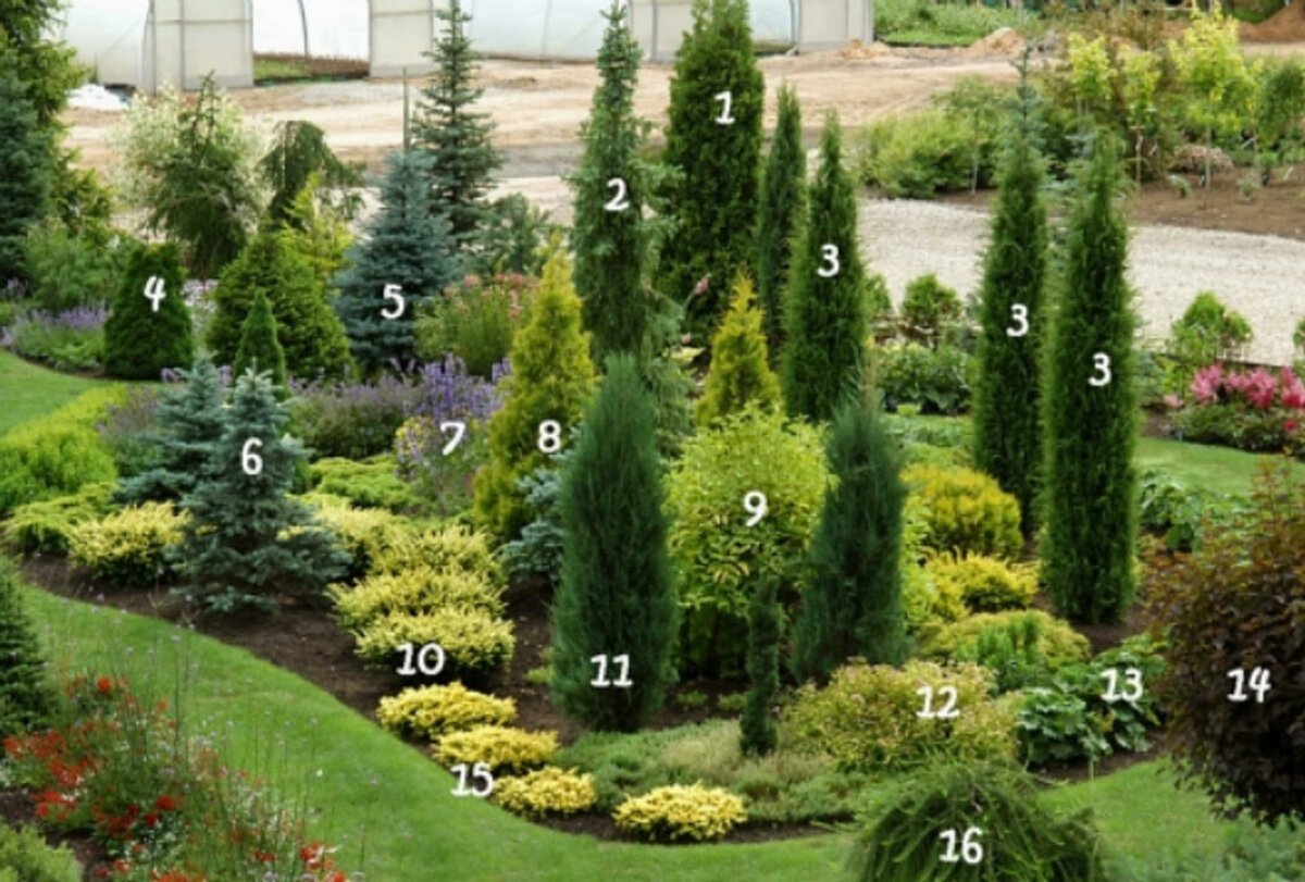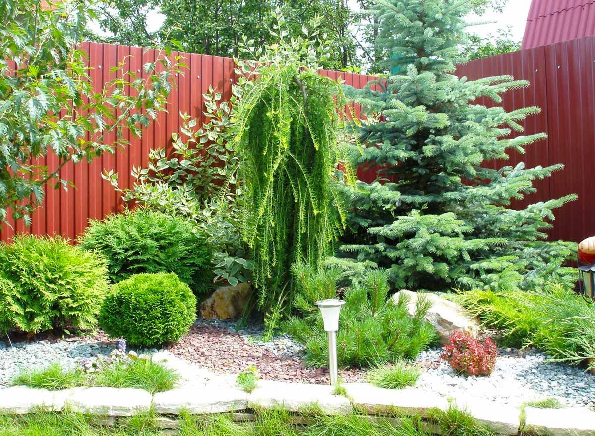 Миксбордер из хвойных и кустарников схемы вдоль забора