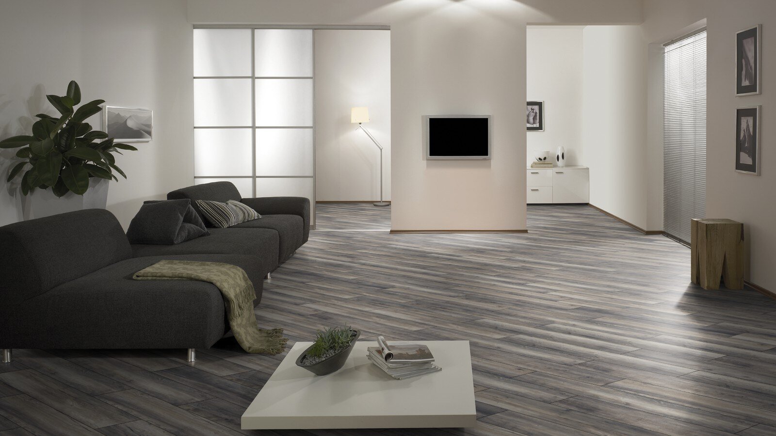 Дизайн комнаты с серым ламинатом
