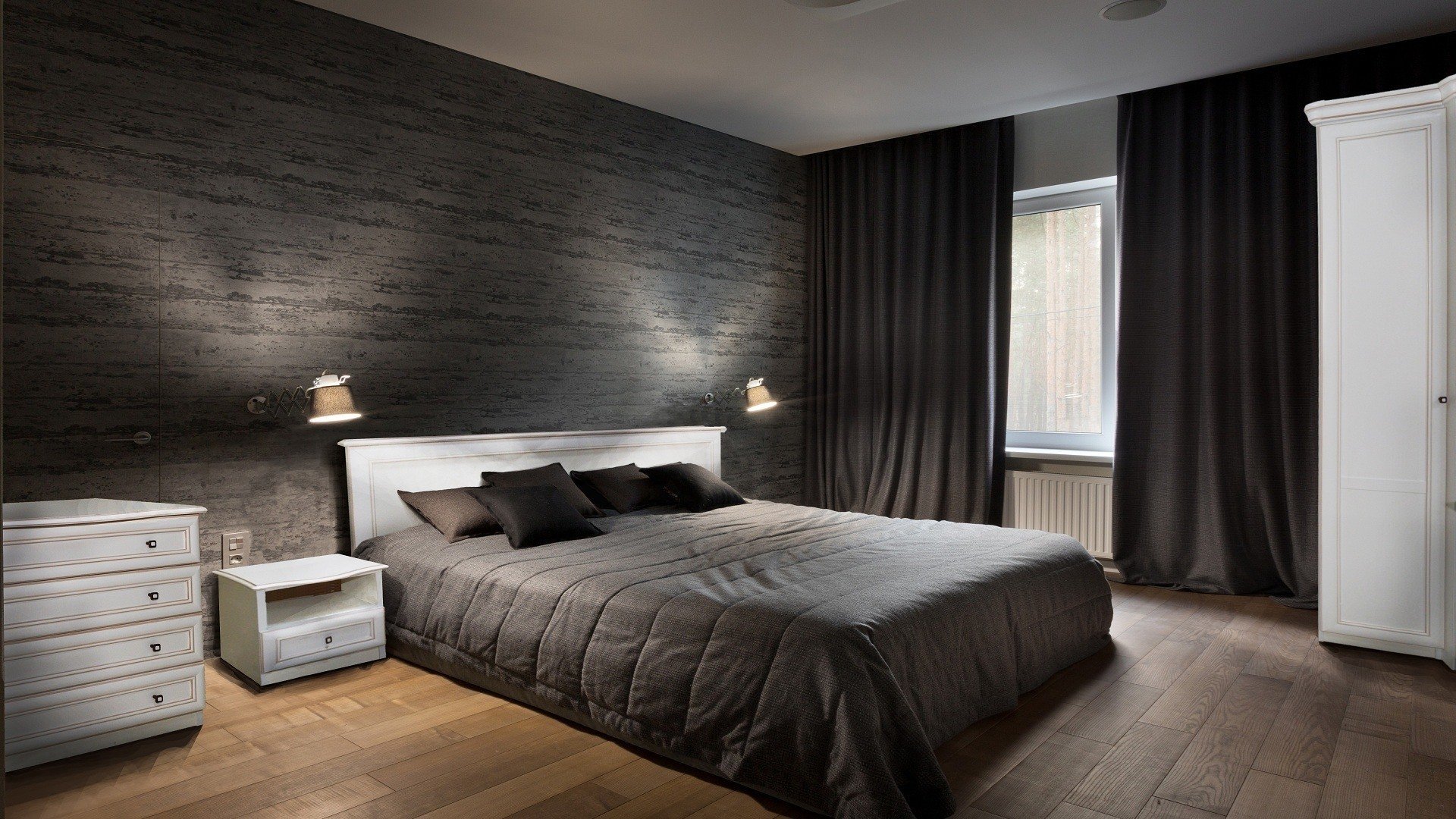 Спальня с темным полом