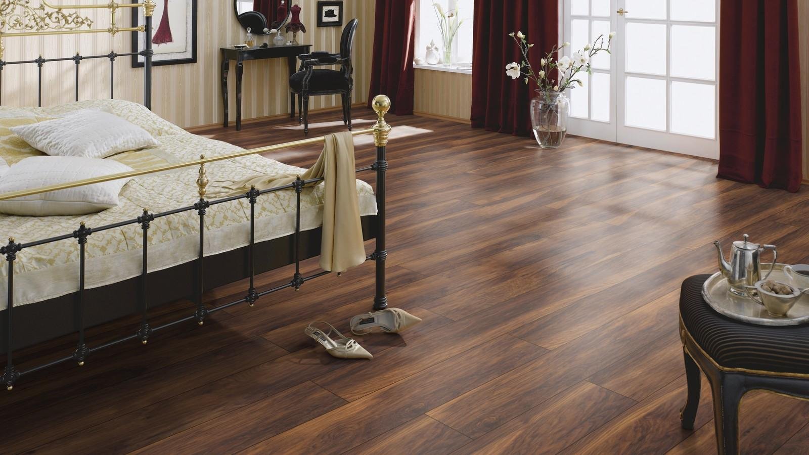 Спальня с коричневым ламинатом