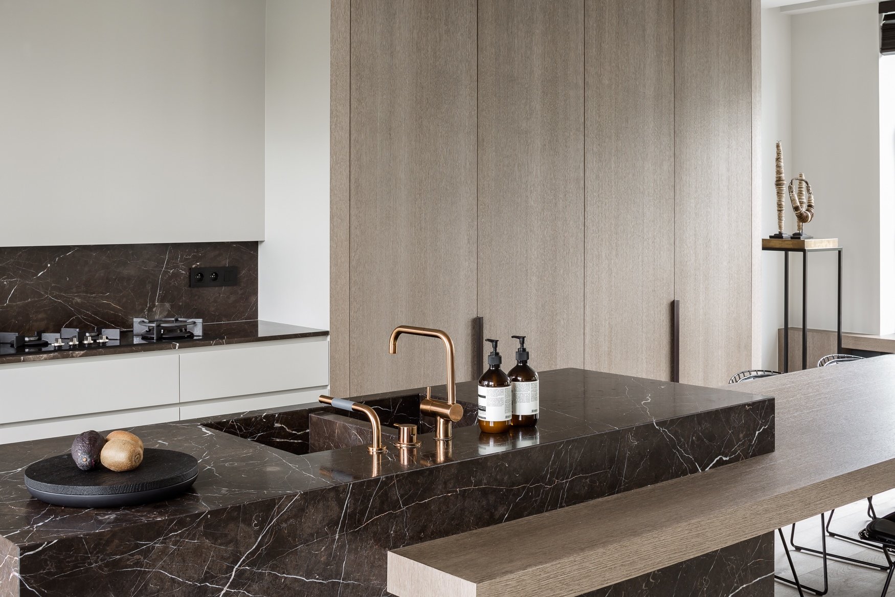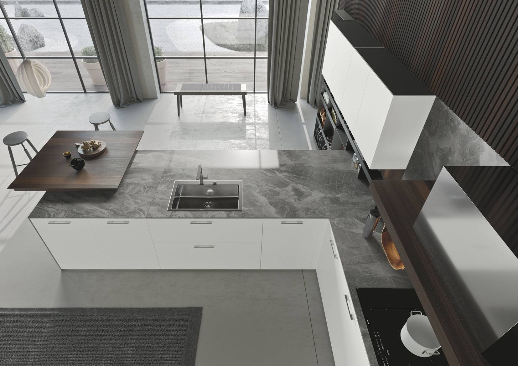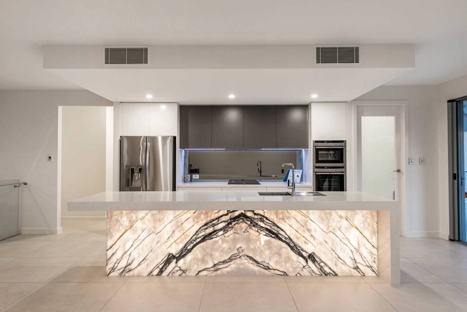Кухня гостиная с мраморным фартуком