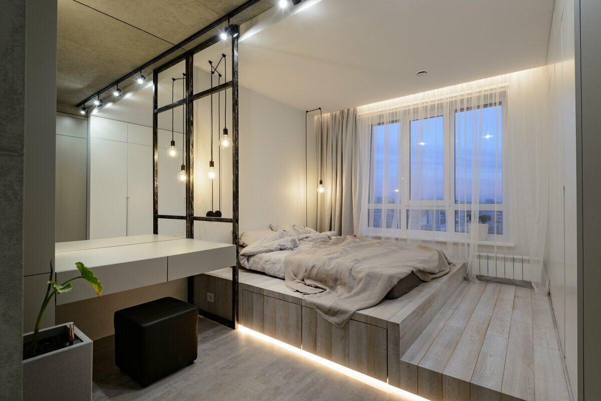 Кровать на подиуме в интерьере