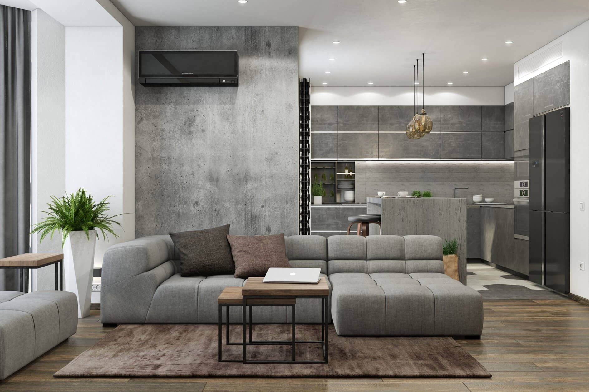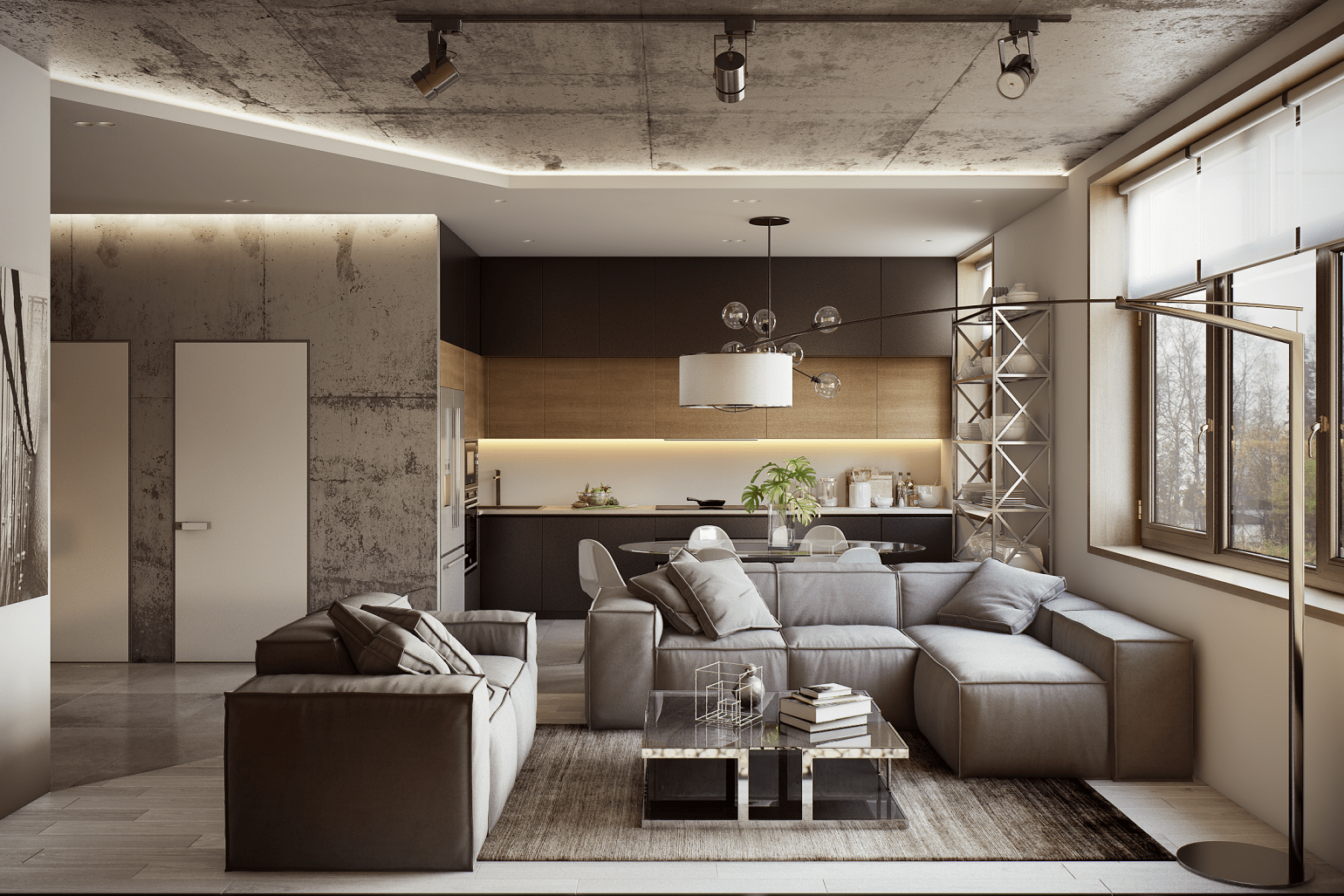 Лофт интерьер гостиной с кухней
