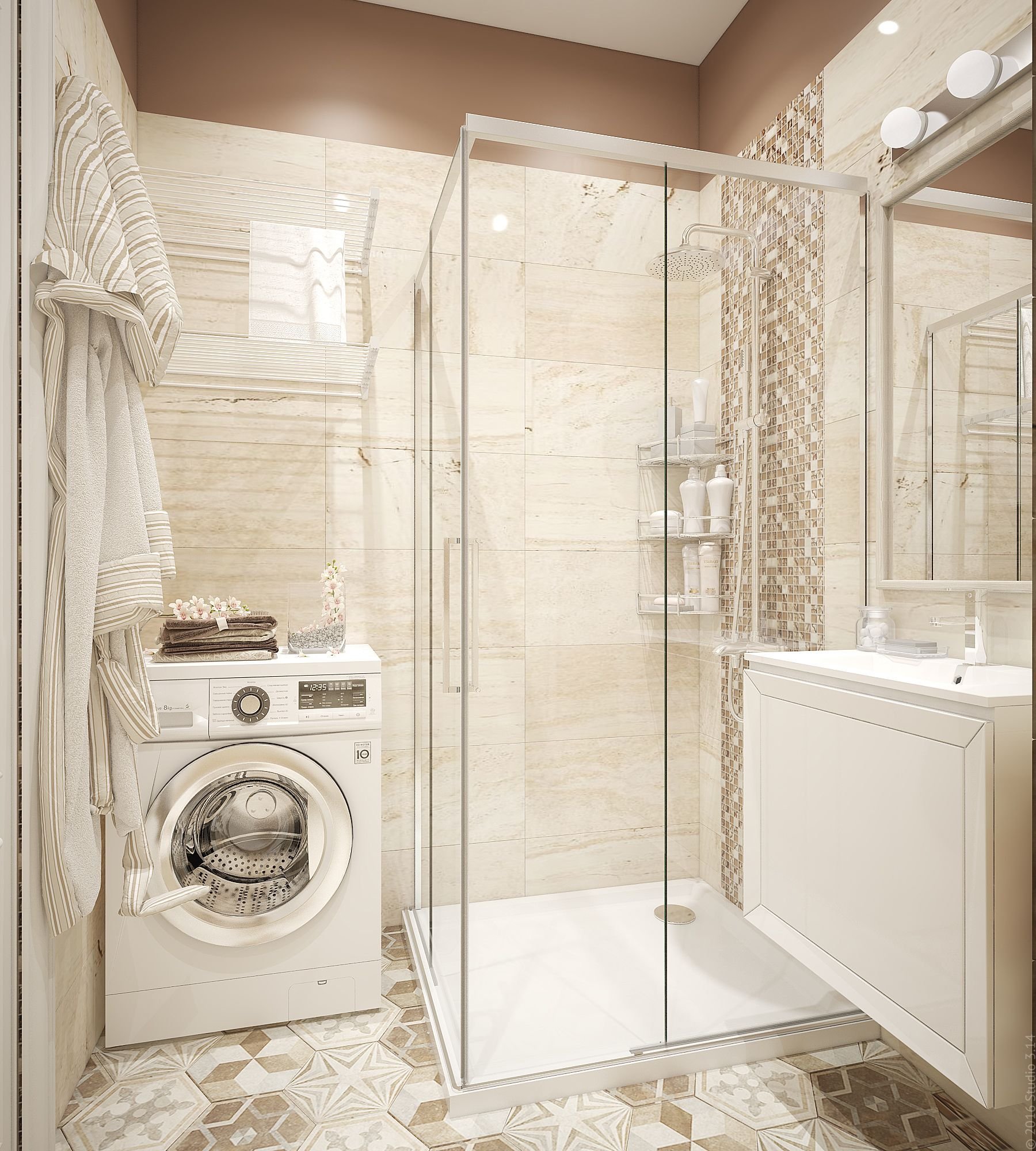 Ванная с душевой кабиной и стиральной машиной
