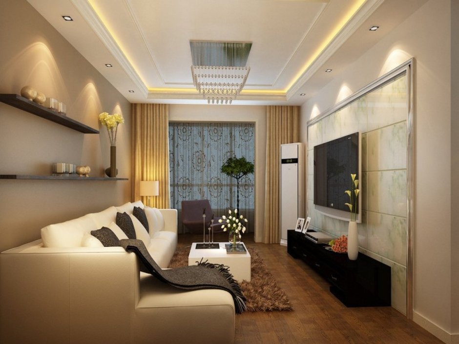Интерьер гостиной узкой и длинной