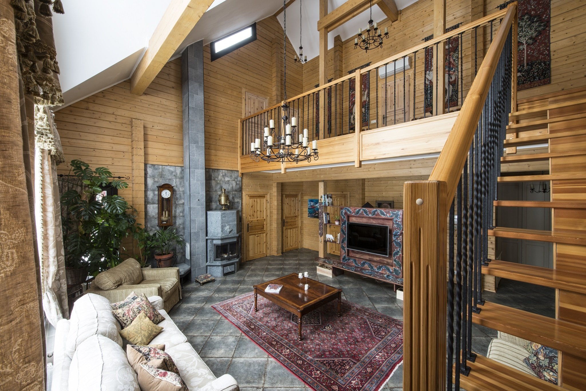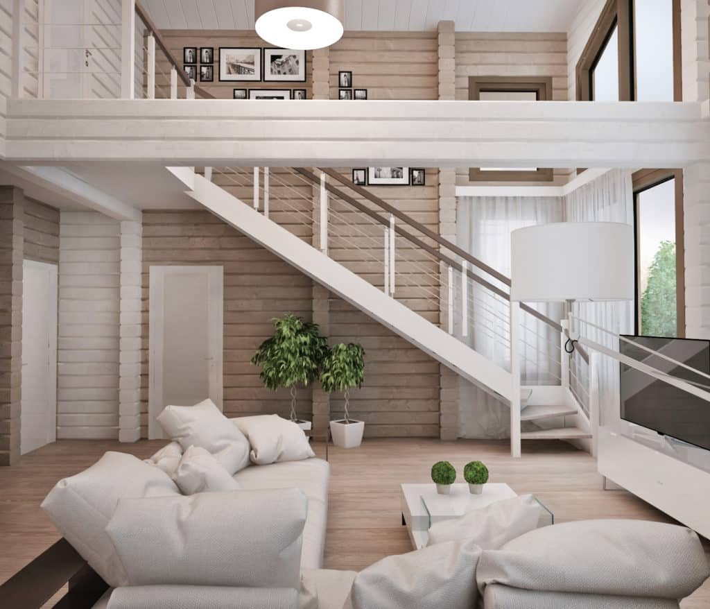 Гостиная с деревянной лестницей