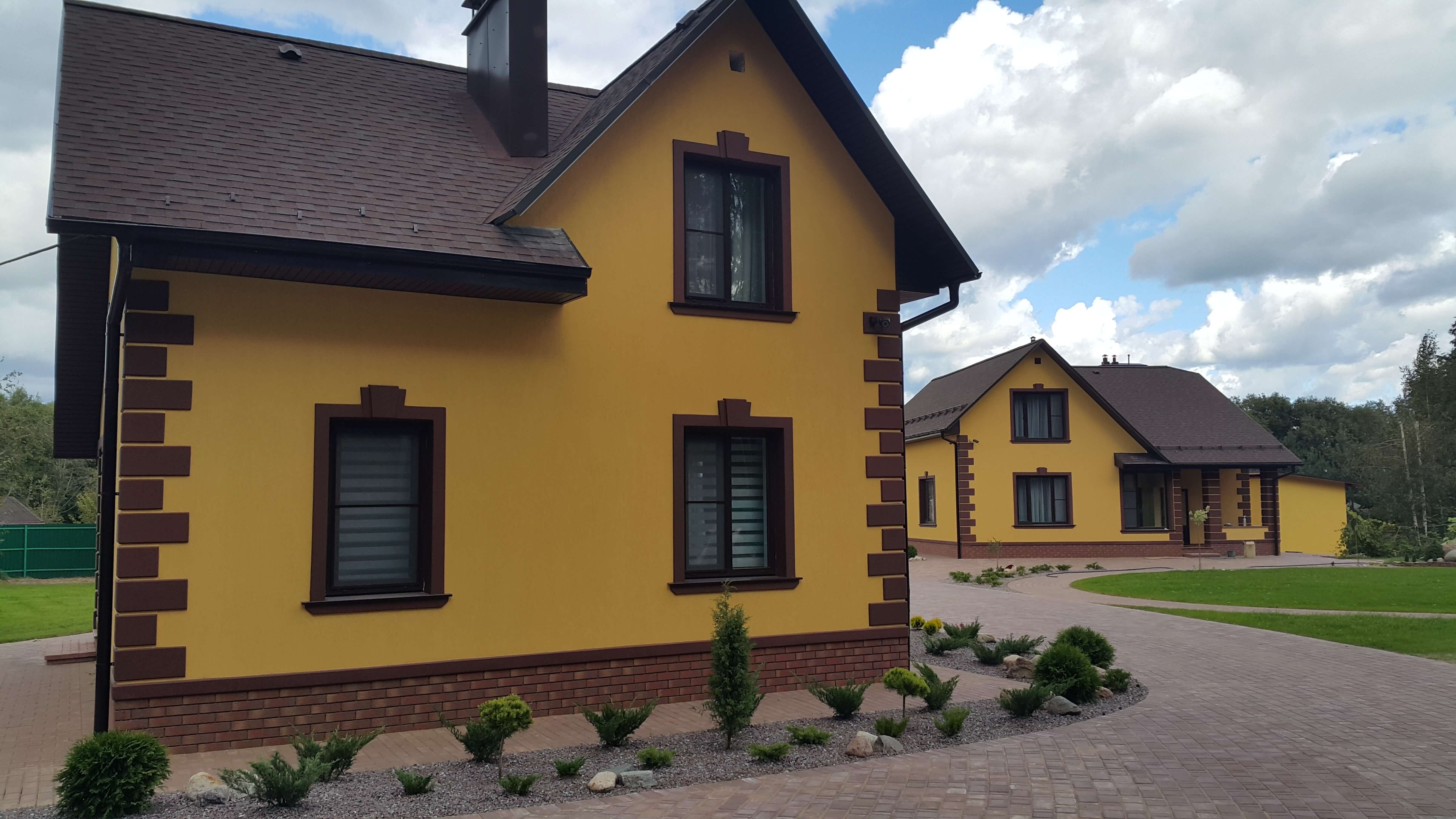 Желтый дом с коричневой крышей