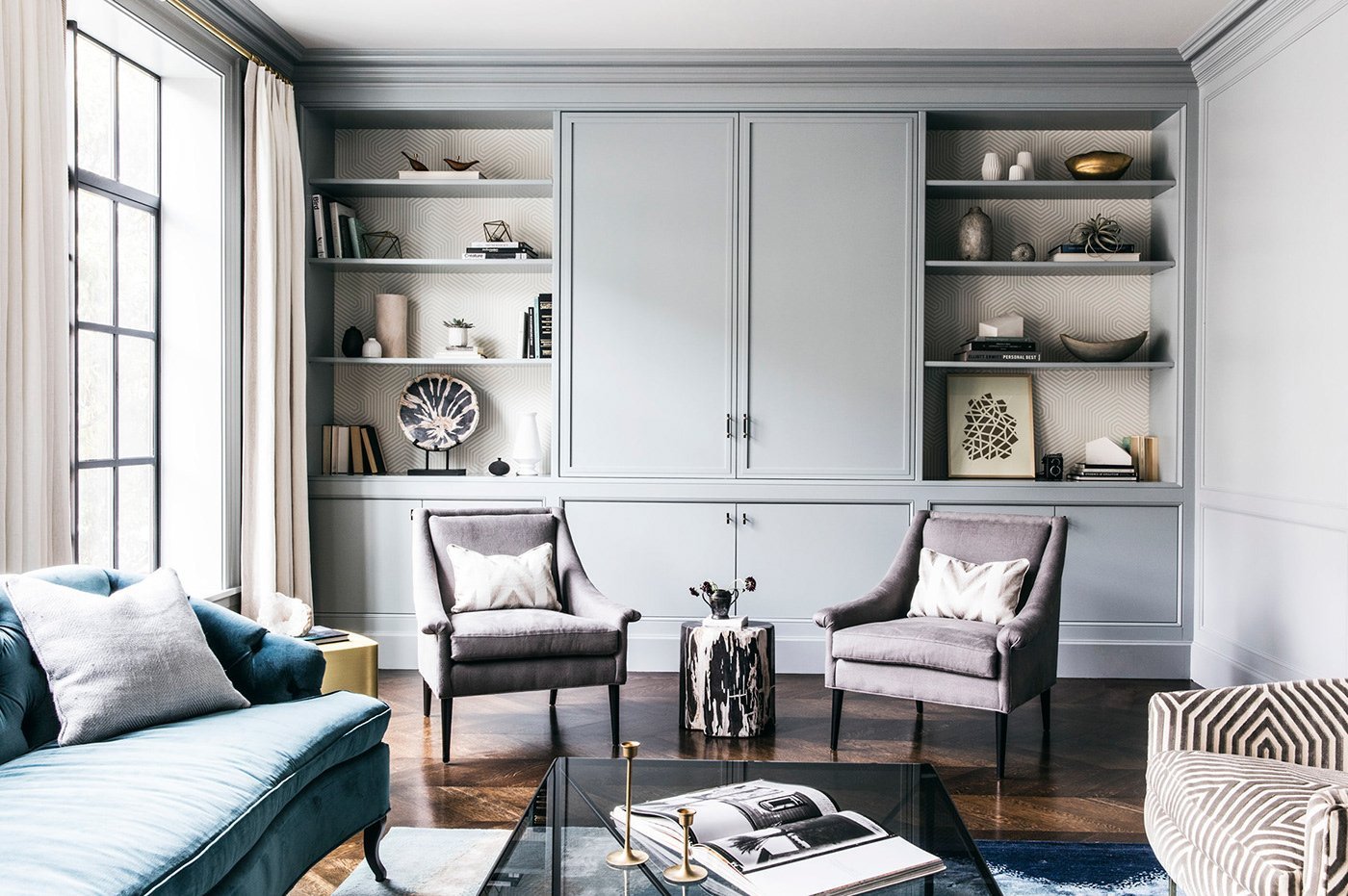 Гостиная с серыми дверями