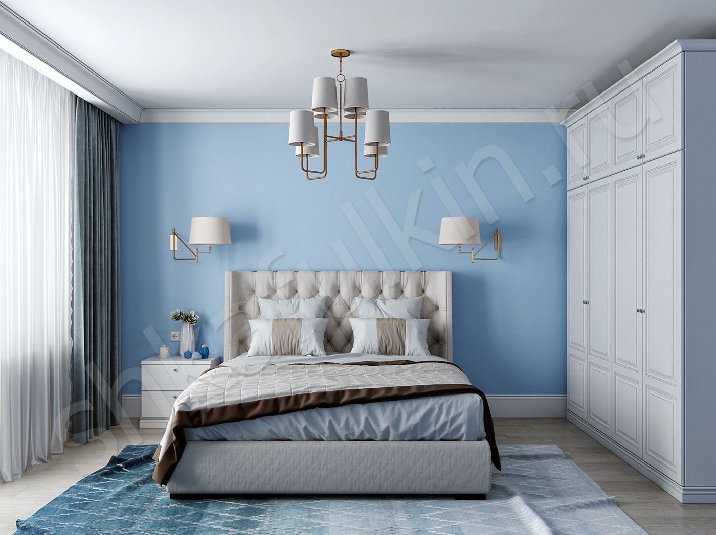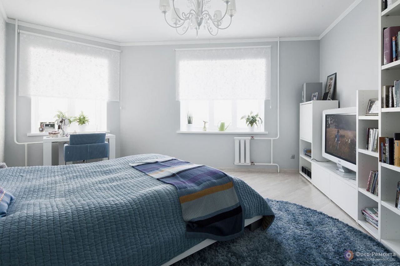 Светлая спальня бело-голубая