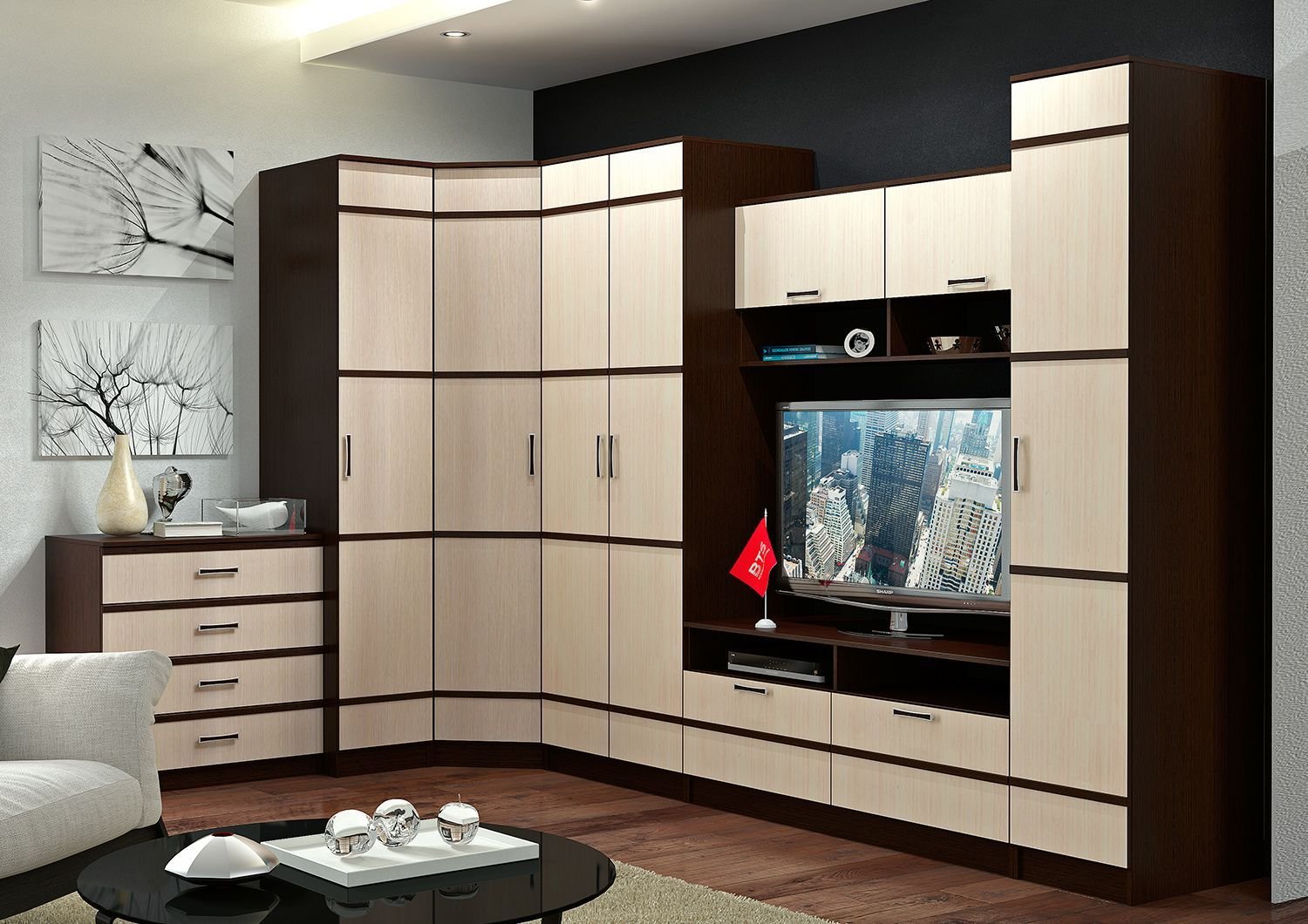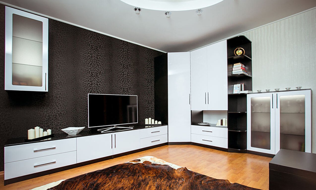 Угловая стенка в гостиную с телевизором в углу