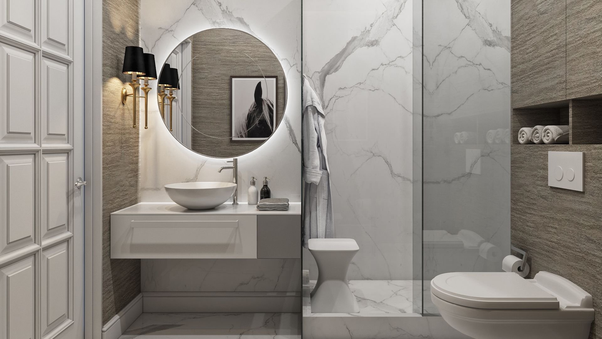 Ванная белый мрамор с бежевым