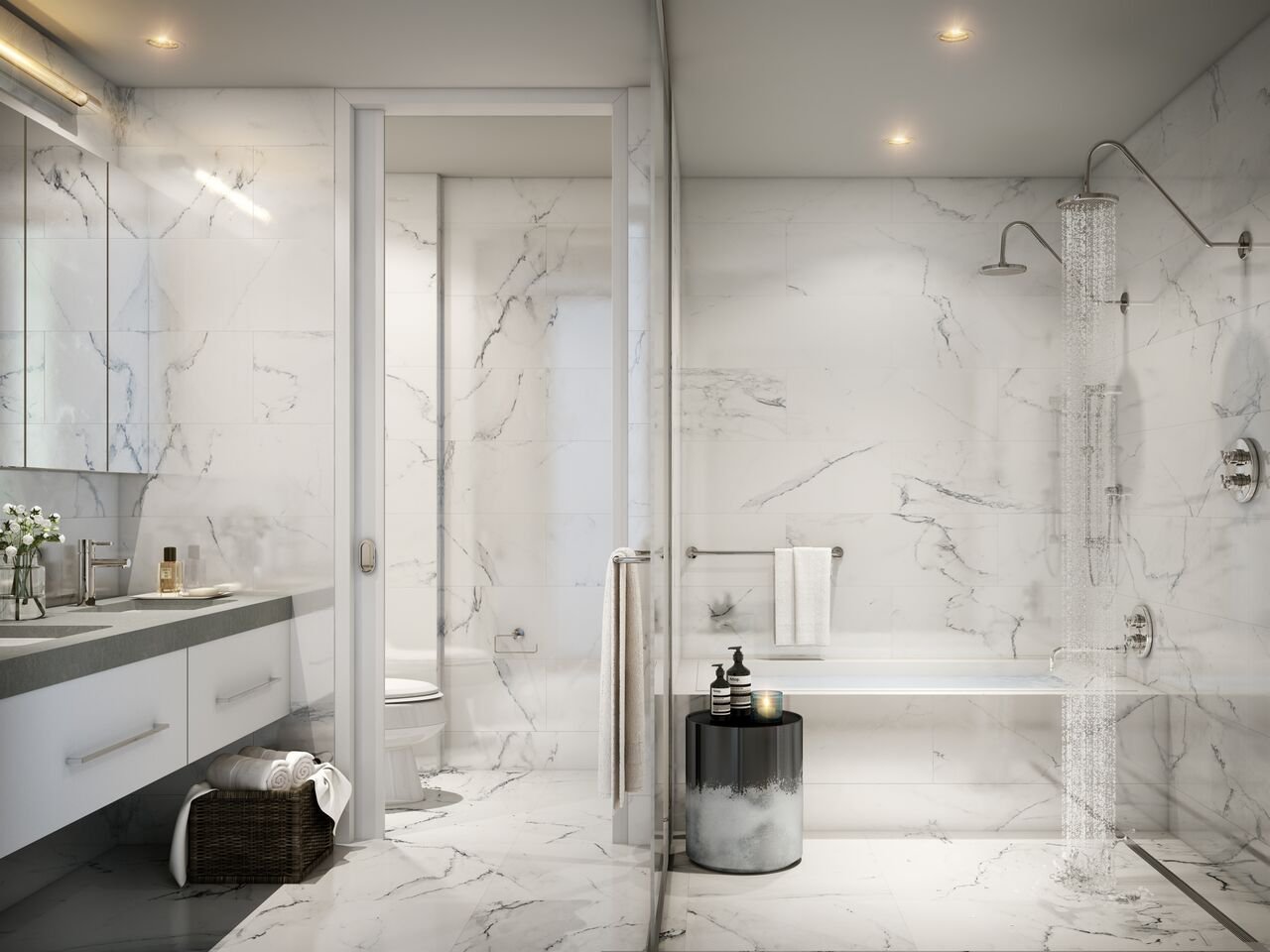 Интерьер санузла с душевой с отделкой под мрамор