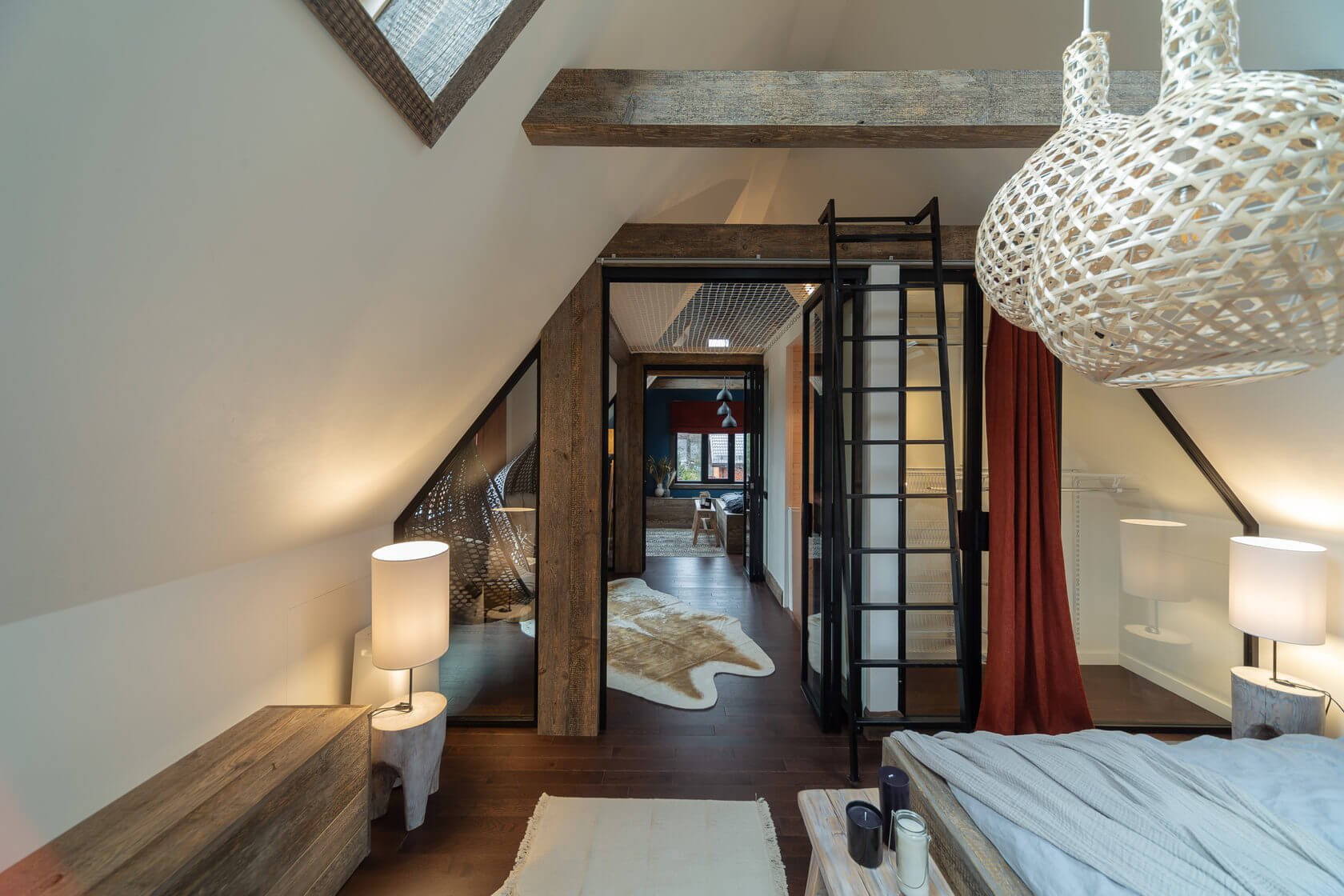 Спальня в стиле лофт с подвесным креслом