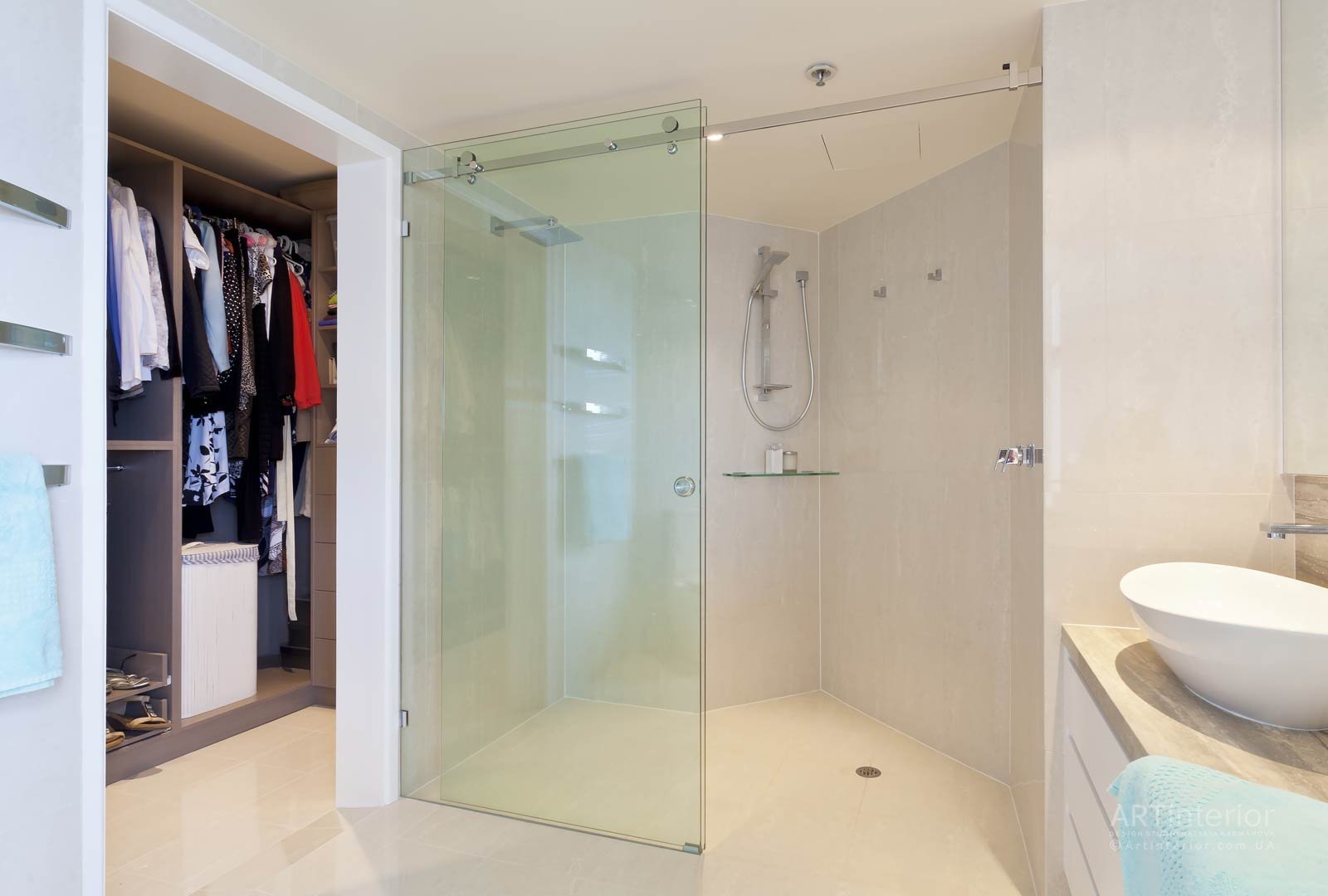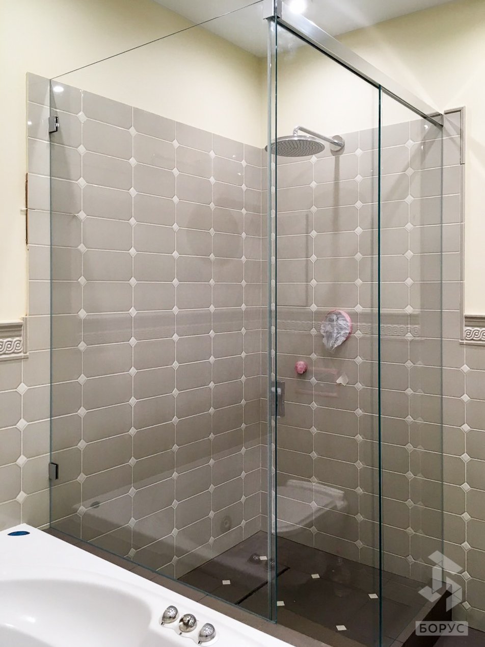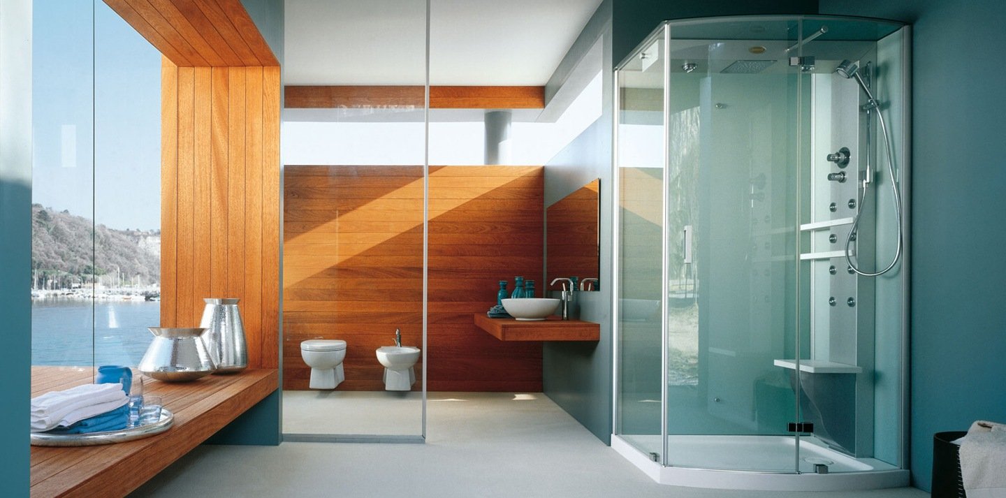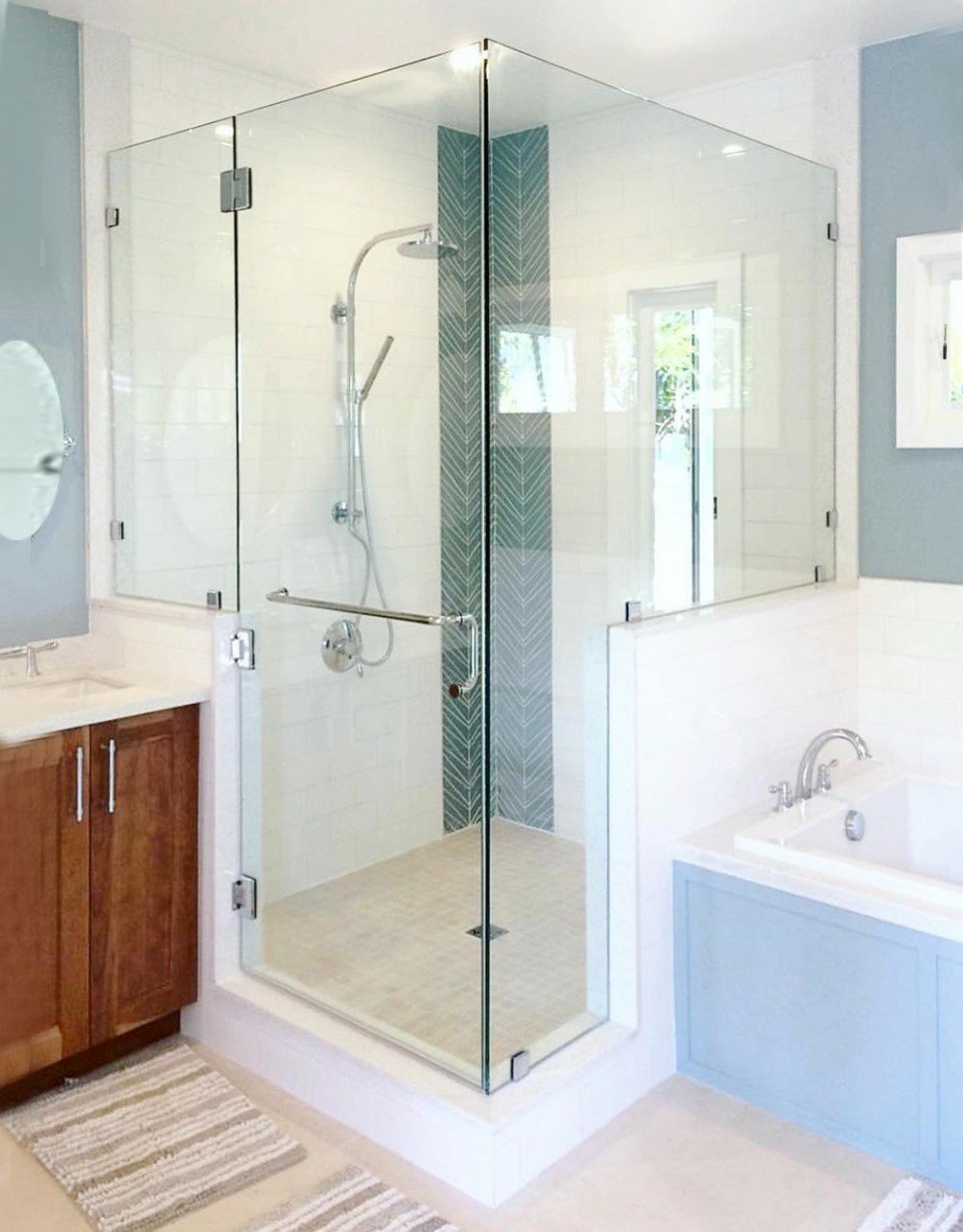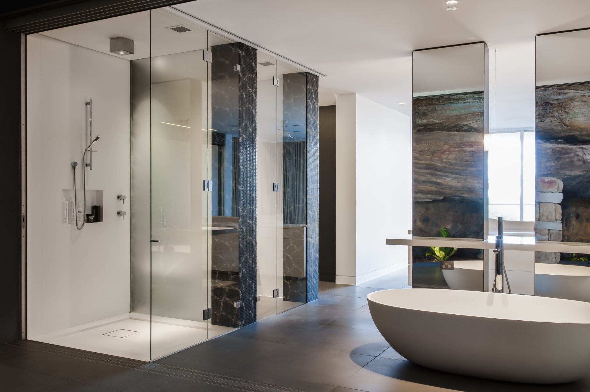 Интерьер ванной комнаты с душевой кабиной и ванной