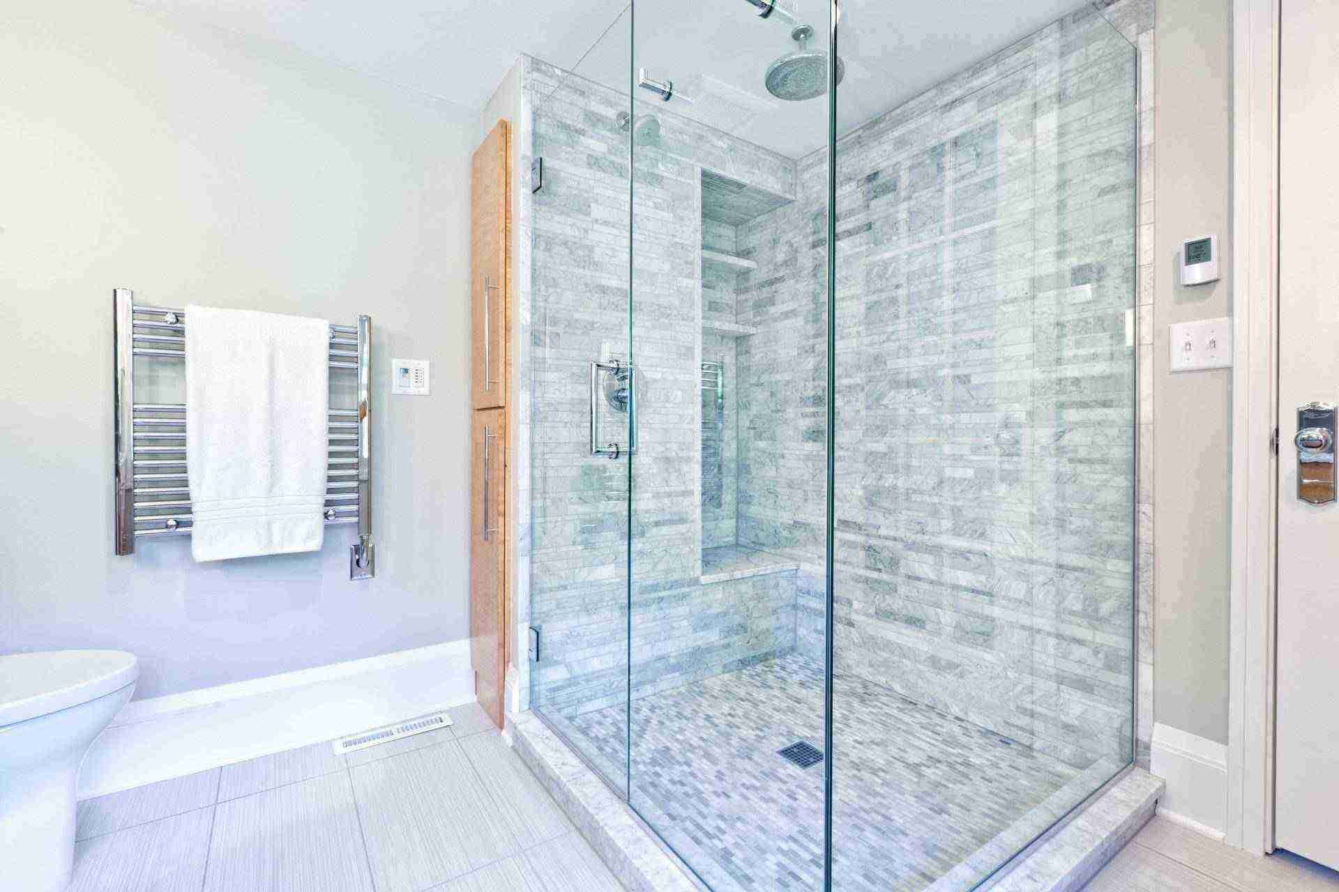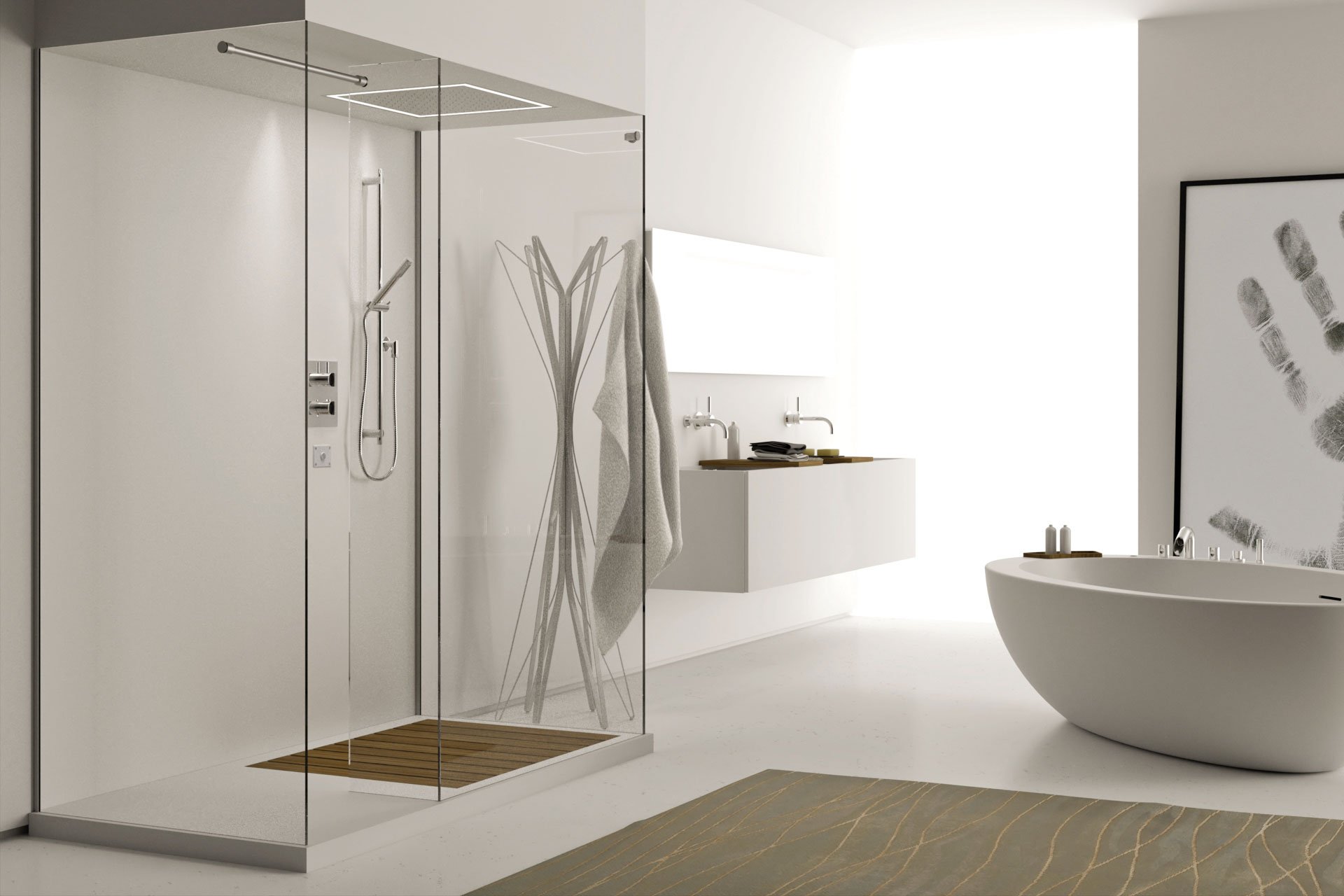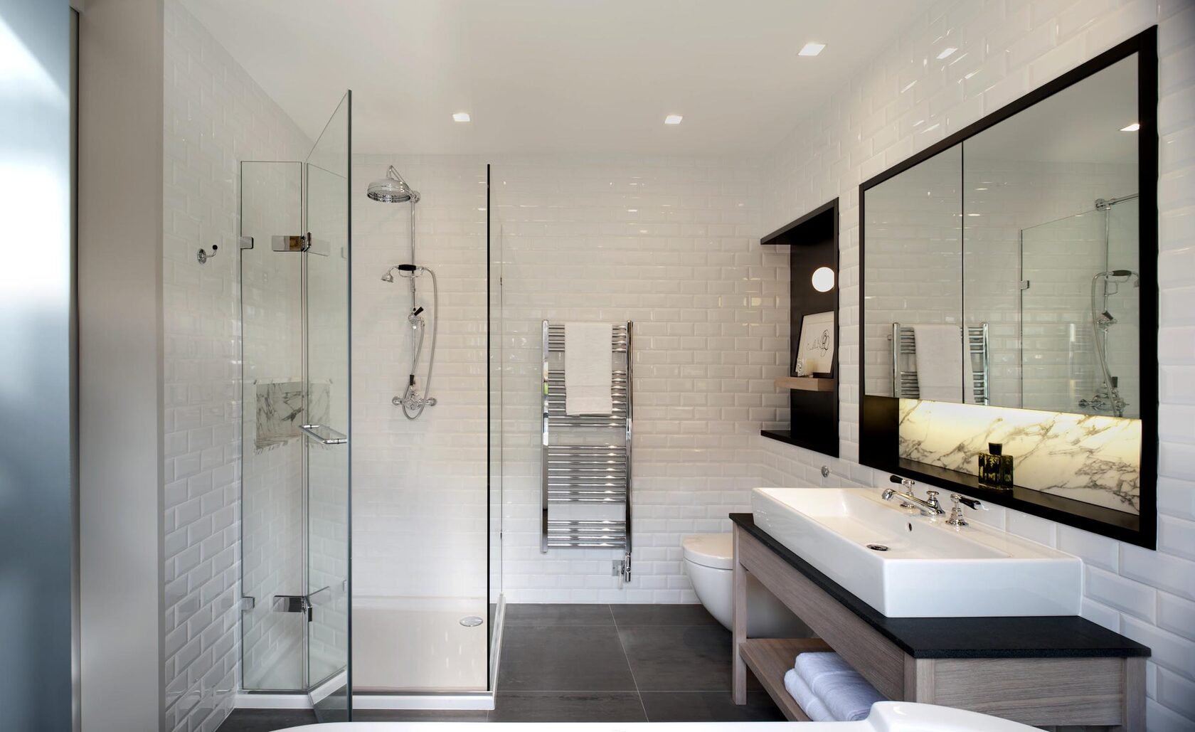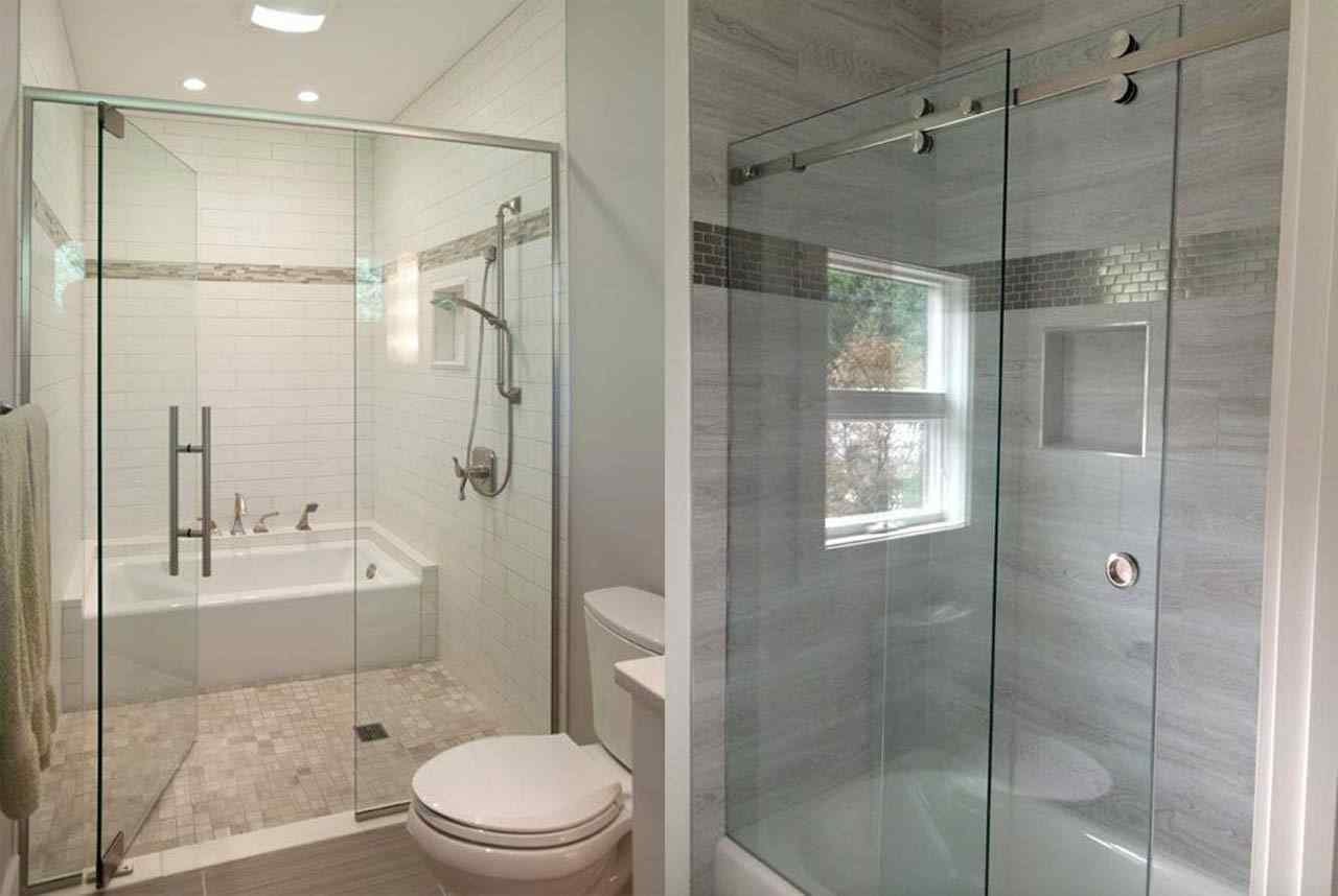 Интерьер ванной комнаты с душевой кабиной и ванной